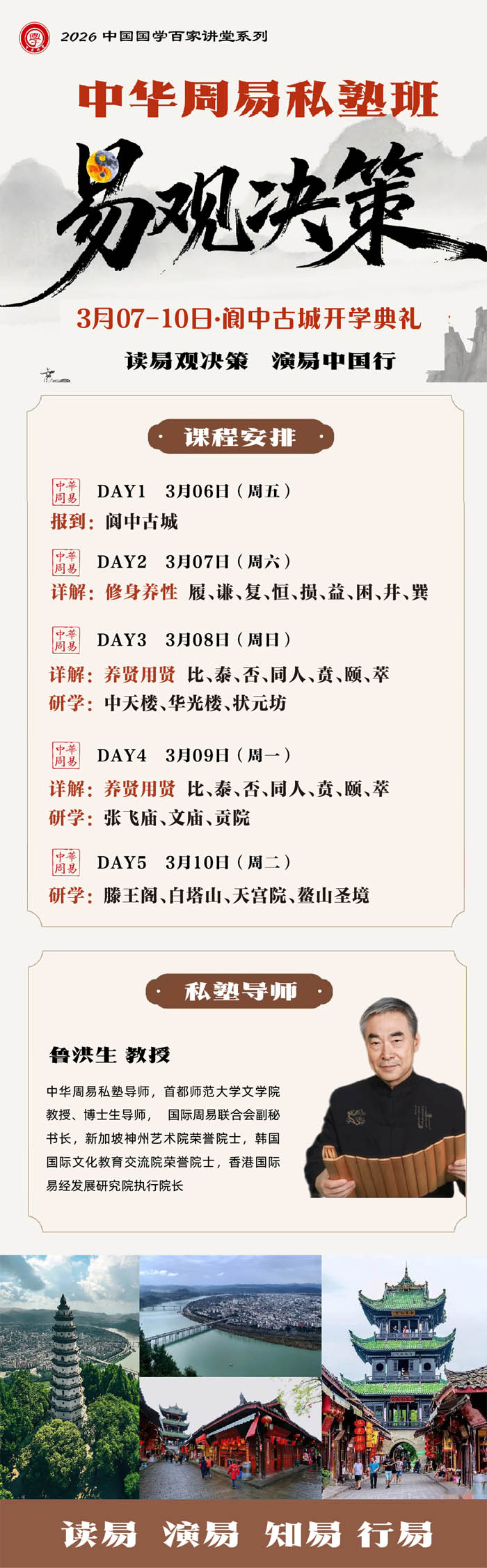 本私塾班定于2026年3月7日至10日集中開課。課程將圍繞《周易》的核心思想與哲學(xué)體系展開,通過魯洪生教授深入淺出的講解,助您讀懂經(jīng)典,成為更通透睿智的人。誠邀有志于探尋中華文化根源、提升哲學(xué)思辨能力的各界人士報(bào)名參加,共同開啟一段追溯智慧源頭的學(xué)習(xí)之旅。