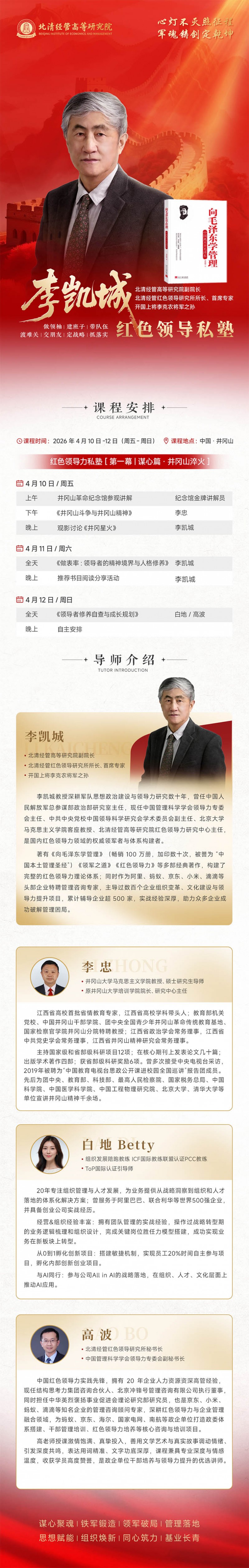 北清經(jīng)管李凱城紅色領(lǐng)導(dǎo)私塾第一期將于2026年4月10-12日,在革命圣地井岡山,開啟「謀心篇?井岡山淬火」精彩課程!