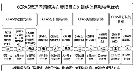 《CPAS復(fù)雜問題系統(tǒng)解決方案?》訓(xùn)練輔導(dǎo)項目,分為“思維模式訓(xùn)練”、“分析技能訓(xùn)練”、“決策技能訓(xùn)練”和“執(zhí)行技能訓(xùn)練”等四大訓(xùn)練模塊,訓(xùn)練體系及特色優(yōu)勢如下表。