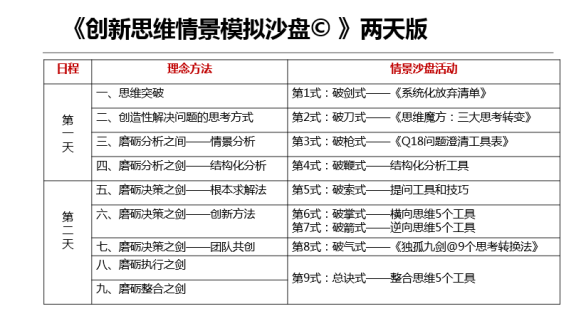 (四) | 沙盤(pán)體驗(yàn) | 第一輪:發(fā)散思維技巧演練 第二輪:橫向思維技巧演練 第三輪:逆向思維技巧演練 第四輪:整合思維技巧演練 第五輪:管理創(chuàng)新—實(shí)務(wù)演練 第六輪:落地方案和成果呈現(xiàn) |
