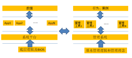 【課程主要架構(gòu)】如同軟件系統(tǒng),它有用戶看不見的底層代碼(BIOS)和系統(tǒng)平臺,在往上是是應(yīng)用軟件(App)和在應(yīng)用軟件上進出的數(shù)據(jù)。該課程,也會討論底層邏輯(基本管理理念),管理系統(tǒng),以及上層的具體管理工具,工具應(yīng)用的具體案例和行為。