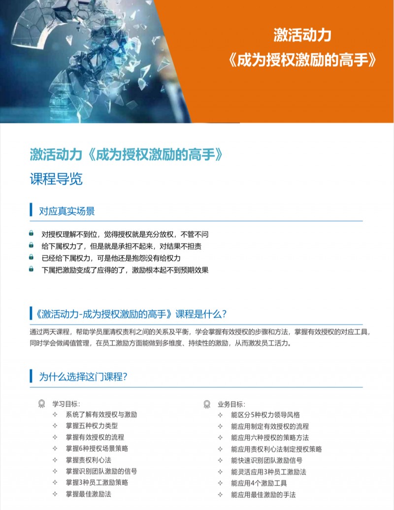 | 課程簡(jiǎn)介: | 成為授權(quán)激勵(lì)的高手,意味著掌握激發(fā)團(tuán)隊(duì)潛能的藝術(shù)。高手們深知,真正的領(lǐng)導(dǎo)力不在于控制,而在于信任與放手。他們精準(zhǔn)識(shí)別團(tuán)隊(duì)成員的優(yōu)勢(shì)與潛力,通過合理授權(quán),讓每個(gè)人都能在其擅長(zhǎng)的領(lǐng)域發(fā)光發(fā)熱。同時(shí),運(yùn)用正面激勵(lì)手段,如認(rèn)可、獎(jiǎng)勵(lì)與成長(zhǎng)機(jī)會(huì),激發(fā)團(tuán)隊(duì)的內(nèi)在動(dòng)力。高手們懂得,有效的授權(quán)與激勵(lì)能夠構(gòu)建積極向上的團(tuán)隊(duì)文化,驅(qū)動(dòng)團(tuán)隊(duì)向更高目標(biāo)沖刺,共創(chuàng)輝煌成就。 | |