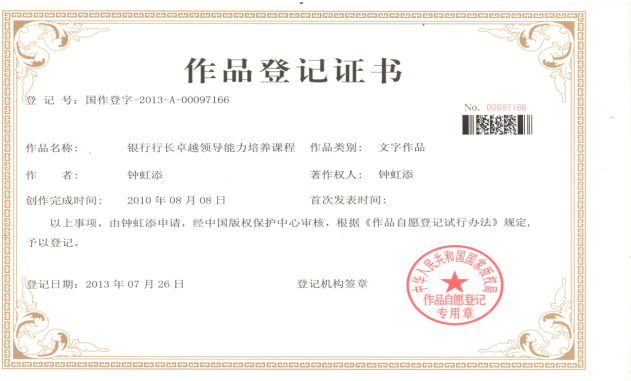 本課程《銀行行長卓越領(lǐng)導(dǎo)力培養(yǎng)》于2013年7月獲得國家知識版權(quán),版權(quán)所有者鐘虹添博士。