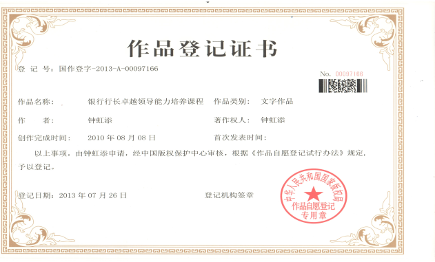本課程《銀行行長卓越領導力培養(yǎng)》于2013年7月獲得國家知識版權,版權所有者鐘虹添教授。