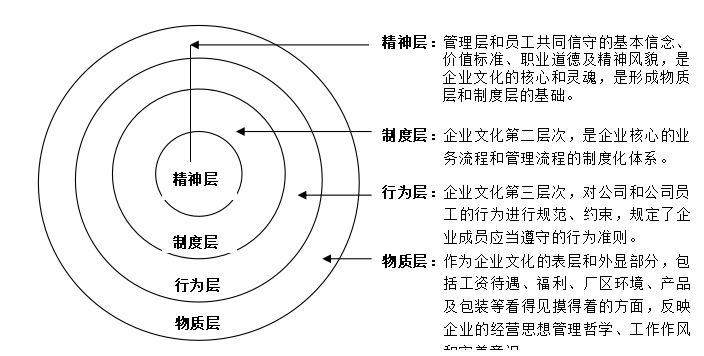 君合智聯(lián)認(rèn)為,企業(yè)文化的建設(shè)一般分四個(gè)層面來(lái)進(jìn)行,即表層的物質(zhì)文化、中層的兩部分行為和制度文化及核心層的精神文化。