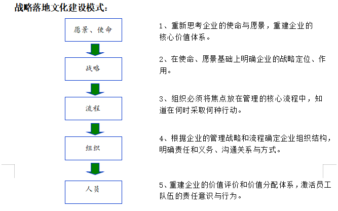 認(rèn)為,企業(yè)文化是企業(yè)的靈魂,是推動(dòng)企業(yè)發(fā)展的不竭動(dòng)力,它所要體現(xiàn)的是企業(yè)的愿景、使命、目標(biāo)、價(jià)值觀和經(jīng)營(yíng)理念,它的建設(shè)最終是為了“戰(zhàn)略落地”;為了“戰(zhàn)略落地”,必須作出系統(tǒng)思考與安排,確立基本價(jià)值理念與系統(tǒng)做事原則,構(gòu)建制度建設(shè)前提,使“文化生根”。