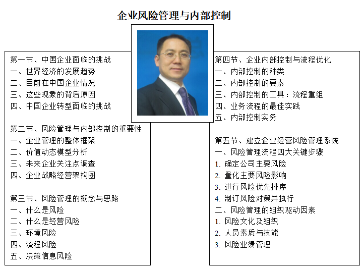 | 課程簡(jiǎn)介: | 企業(yè)風(fēng)險(xiǎn)管理與內(nèi)部控制是企業(yè)穩(wěn)健運(yùn)營(yíng)的基石。它通過(guò)識(shí)別、評(píng)估、應(yīng)對(duì)潛在風(fēng)險(xiǎn),確保企業(yè)資產(chǎn)安全、財(cái)務(wù)信息的真實(shí)完整,以及法律法規(guī)的遵守。內(nèi)部控制體系涵蓋財(cái)務(wù)、運(yùn)營(yíng)、合規(guī)等多個(gè)方面,旨在建立健全的規(guī)章制度,規(guī)范業(yè)務(wù)流程,提升管理效率。企業(yè)風(fēng)險(xiǎn)管理則側(cè)重于前瞻性地識(shí)別市場(chǎng)、信用、操作等風(fēng)險(xiǎn),制定應(yīng)對(duì)策略,減少不確定性對(duì)企業(yè)的影響。兩者相輔相成,共同保障企業(yè)的健康穩(wěn)定發(fā)展,提升市場(chǎng)競(jìng)爭(zhēng)力。 | |
