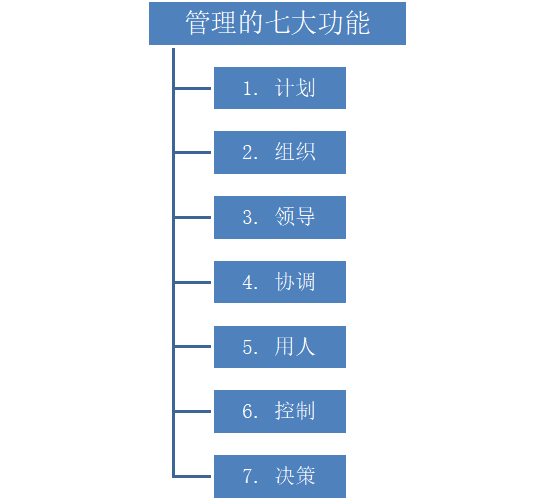 對(duì)于管理者應(yīng)具備的知識(shí)和技巧,早期的管理理論將管理的工作分為企劃、組織、領(lǐng)導(dǎo)及控制,但這四種分法不但過(guò)時(shí),而且無(wú)法涵蓋管理的所有功能。根據(jù)近幾年專家學(xué)者的研究,把現(xiàn)代管理功能描述重新歸類,管理的工作可以分為以下七個(gè)功能,課程內(nèi)容也是針對(duì)這七個(gè)功能來(lái)展開(kāi):