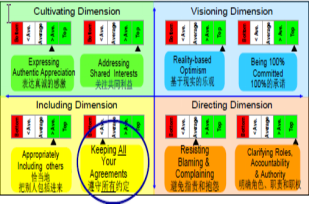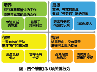 支持四個維度的是八項行為(見下面圖:四個維度和八項關(guān)鍵行為)。通過測評,診斷出團(tuán)隊在八個行為層面的分?jǐn)?shù)以及所處水平(見下面圖一),了解到本團(tuán)隊的優(yōu)勢和不足,通過培訓(xùn)工作坊和教練方式,幫助團(tuán)隊發(fā)現(xiàn)根源問題,突破意識和觀念的限制,固化行為,按照AMBR(注意力、心態(tài)、行為、結(jié)果)四個步驟,遵從“注意力在哪里,能量就流向哪里“的原則,固化團(tuán)隊成員的行為習(xí)慣,從而改善領(lǐng)導(dǎo)力和團(tuán)隊的背景(文化、氛圍、心態(tài)等)。