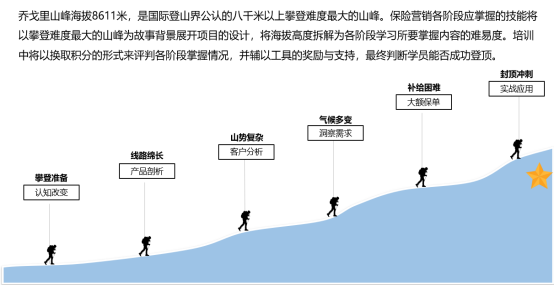 本次課程將以攀登高峰的形式將海拔高度拆解為各階段學(xué)習(xí)所要掌握內(nèi)容的難易程度,通過(guò)進(jìn)階的模式來(lái)全面提升員工學(xué)習(xí)的積極性以及快速掌握營(yíng)銷的必備技能:產(chǎn)品營(yíng)銷能力、KYC客戶分析能力、大額保單促成能力。