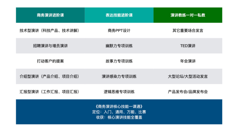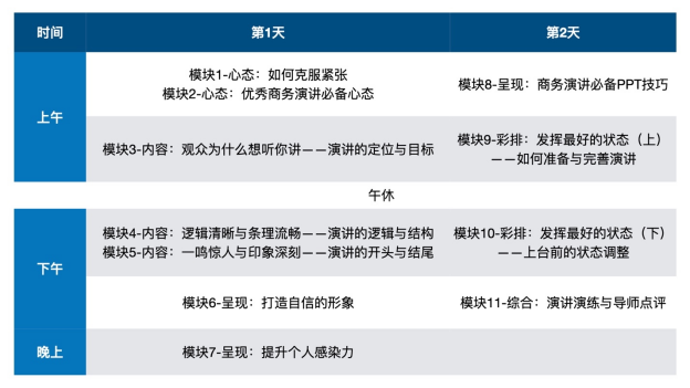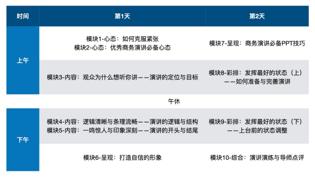 1、學(xué)員能夠用短時間學(xué)到大部分商務(wù)場景中,公眾演講發(fā)言的核心技能;