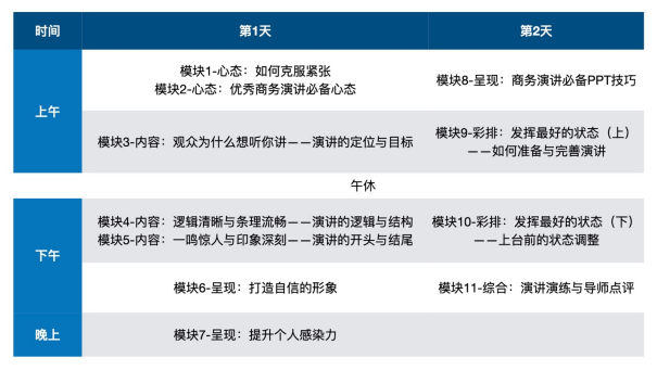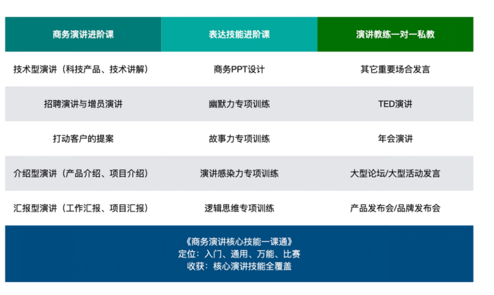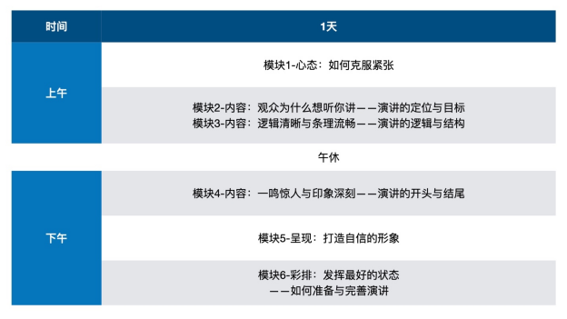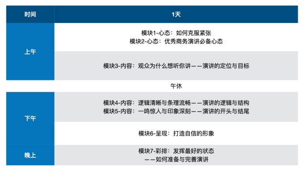 1、學(xué)員能夠用短時(shí)間學(xué)到大部分商務(wù)場景中,公眾演講發(fā)言的核心技能;