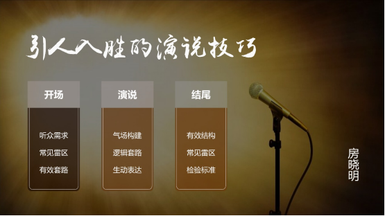 | 課程簡介: | "引人入勝的演說技巧"是一門專注于提升公眾演說魅力的課程。通過教授如何抓住聽眾注意力、構(gòu)建引人入勝的開場白、運用故事與情感共鳴、以及掌握聲音與肢體語言等技巧,本課程旨在幫助學(xué)員成為舞臺上的閃耀之星。無論是商務(wù)演講、學(xué)術(shù)報告還是日常溝通,這些技巧都能讓你的話語更具吸引力,激發(fā)聽眾興趣,留下深刻印象。學(xué)習(xí)本課程,讓你的每一次發(fā)言都成為難忘的精彩瞬間。 | |
