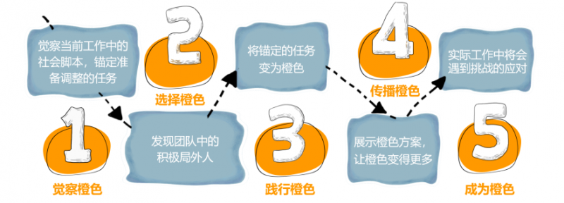 覺(jué)察橙色——選擇橙色——傳播橙色——踐行橙色——成為橙色