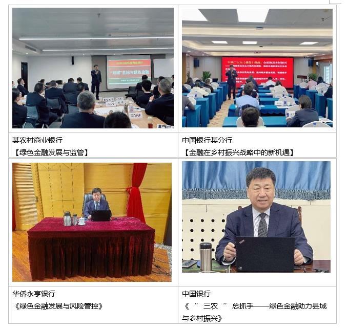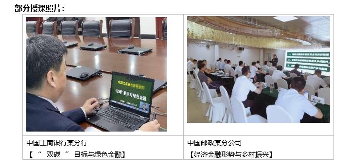 【精進專業(yè)】-曾持續(xù)5年為人民銀行、儲蓄銀行、農(nóng)業(yè)銀行等多家銀行開展“雙碳與綠色金融、投行業(yè)務(wù)、資金運營、鄉(xiāng)村振興”等多門培訓百余場,提升銀行管理人員金融業(yè)務(wù)水平與能力,拓展銀行金融業(yè)務(wù)線人才庫。