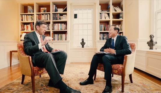 ( 圖片說明:2016 年 11 月 21 日在哈佛商學(xué)院,那國毅作為格局商 學(xué)國際部主任訪談“顛覆式創(chuàng)新之父”克里斯滕森教授)