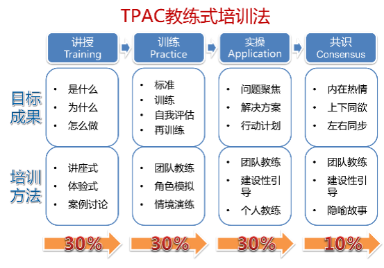 綜合運用多種培訓(xùn)方法:根據(jù)課程階段的不同,實施最能實現(xiàn)該階段內(nèi)容的培訓(xùn)方法,重點突出教練技術(shù);