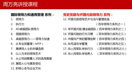 系列“紅色領(lǐng)導(dǎo)力” 培訓(xùn)導(dǎo)師。為企 ·事業(yè)中高管、為北大、人大、有關(guān)部委、軍隊講授領(lǐng)導(dǎo)力執(zhí)行力、 開國元勛領(lǐng)導(dǎo)力 (黨史黨建與紅色管理相結(jié)合)、