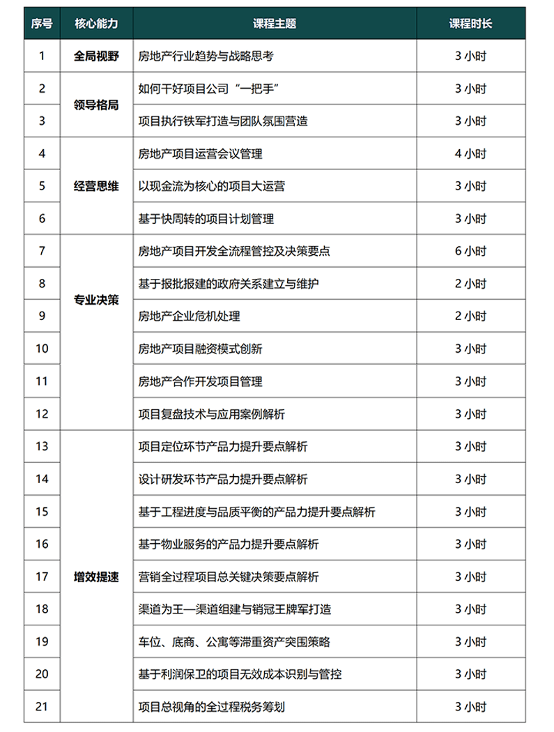 基于此,北京大學(xué)房地產(chǎn)研究課題組在深入研究總結(jié)100位+優(yōu)秀項(xiàng)目操盤(pán)手核心能力的基礎(chǔ)上,結(jié)合新的營(yíng)商環(huán)境,對(duì)「2020標(biāo)桿地產(chǎn)項(xiàng)目總精英訓(xùn)戰(zhàn)營(yíng)」課程體系煥新升級(jí),旨在為房企加速培養(yǎng)能夠獨(dú)立操盤(pán)項(xiàng)目,適應(yīng)當(dāng)前形勢(shì),獨(dú)當(dāng)一面的項(xiàng)目?jī)?yōu)秀人才!