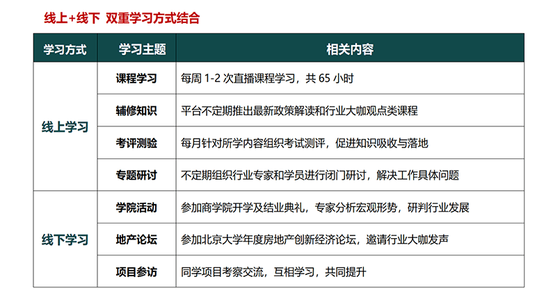 線下面授課程:1次開(kāi)學(xué)典禮,一次房地產(chǎn)行業(yè)論壇,不定期線下參訪、考察、交流活動(dòng)。
