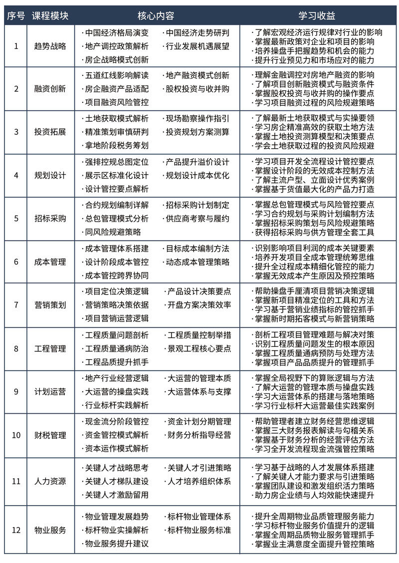 如今房地產(chǎn)市場(chǎng)發(fā)生了巨大變化,但當(dāng)年此項(xiàng)目所倡導(dǎo)的核心價(jià)值和市場(chǎng)化趨勢(shì)更加得到了充分的驗(yàn)證。房地產(chǎn)行業(yè)經(jīng)歷了“土地紅利”時(shí)代、“資本紅利”時(shí)代后,正式進(jìn)入到了“管理紅利”時(shí)代,在“管理紅利“時(shí)代,向管理要效益,向?qū)I(yè)要利潤(rùn)是全流程精細(xì)化管理的核心要點(diǎn),標(biāo)桿地產(chǎn)課程研發(fā)中心在原有項(xiàng)目上,保留其核心價(jià)值思想,對(duì)專業(yè)內(nèi)容重新定位升級(jí),重磅推出針對(duì)中小型房地產(chǎn)企業(yè)家和項(xiàng)目領(lǐng)軍人的精品研修項(xiàng)目《標(biāo)桿地產(chǎn)全流程精細(xì)化管理高級(jí)研修班》,助力企業(yè)發(fā)展升級(jí)。
