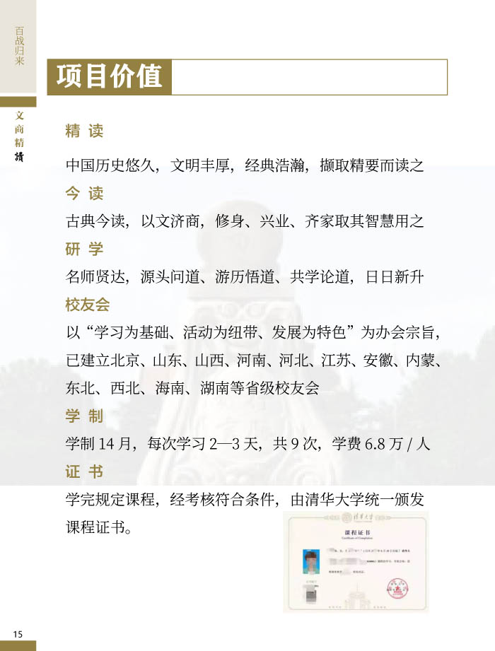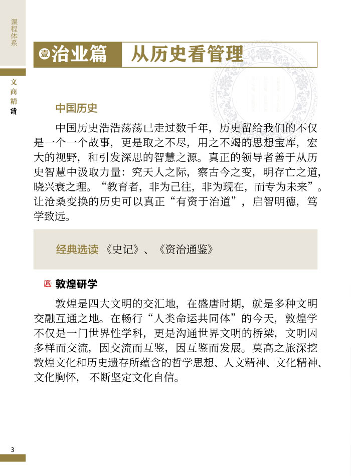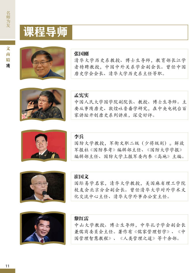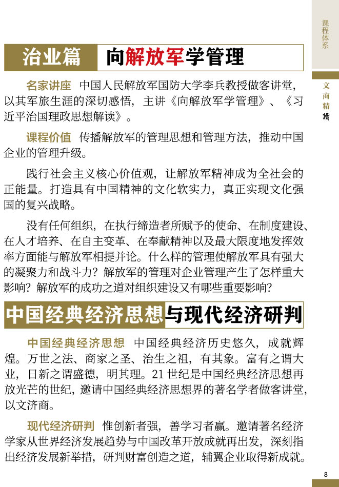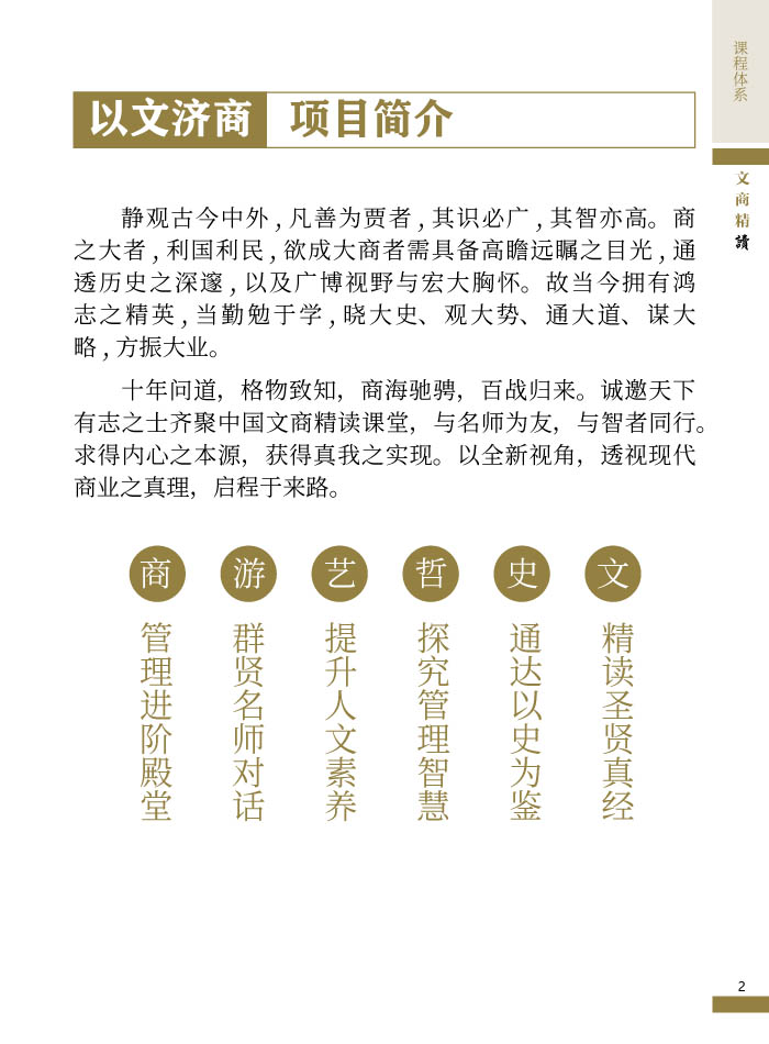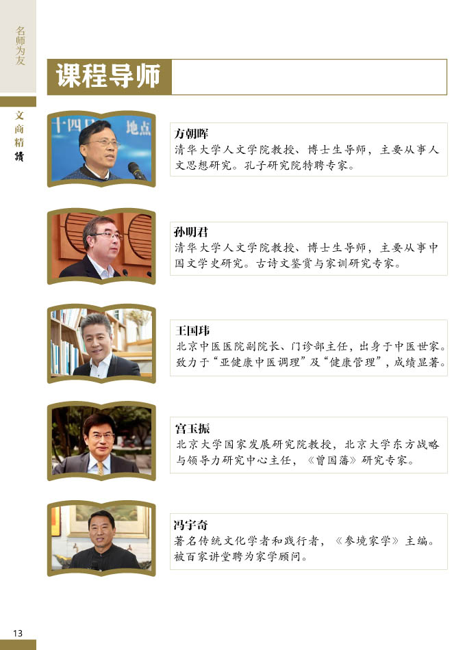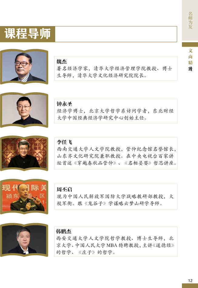 | 課程簡介: | 十年問道,格物致知,商海馳騁,百戰(zhàn)歸來。誠邀天下 有志之士齊聚中國文商精讀課堂,與名師為友,與智者同行。 求得內(nèi)心之本源,獲得真我之實現(xiàn)。以全新視角,透視現(xiàn)代 商業(yè)之真理,啟程于來路。 | |