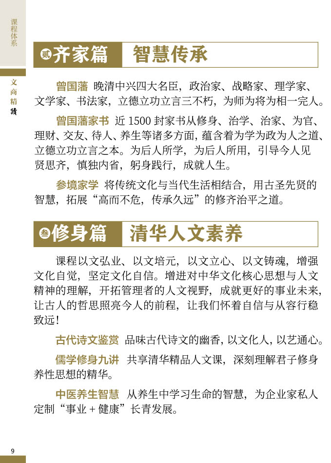 | 課程分類: | 總裁研修班 | 董事長培訓(xùn) | 工商管理班 | 金融研修班 | 國學(xué)研修班 | 行業(yè)研修班 | 財務(wù)研修班 | 營銷研修班 | 人力研修班 | 短期研修班 | 女性研修班 | 藝術(shù)品研修班 | 制造業(yè)研修班 | 數(shù)字化研修班 | 房地產(chǎn)研修班 | 建筑業(yè)研修班 | | |