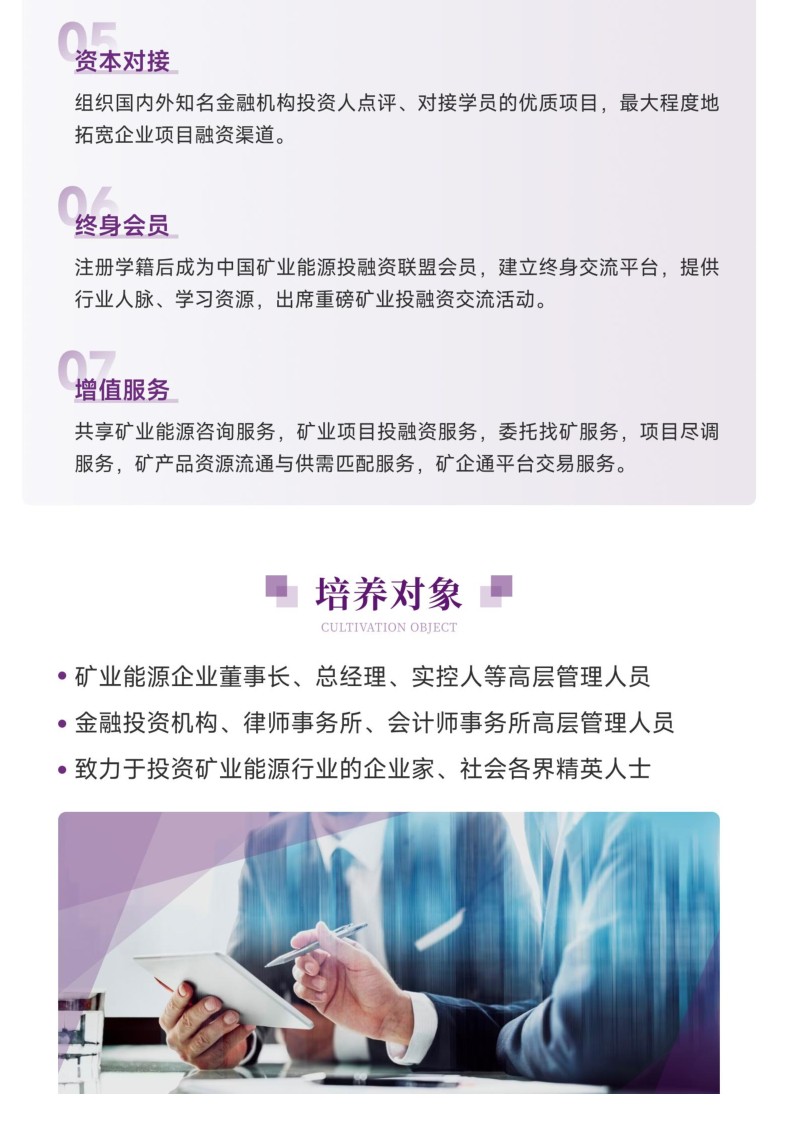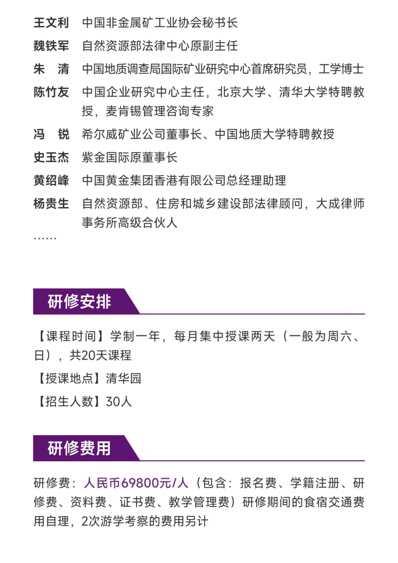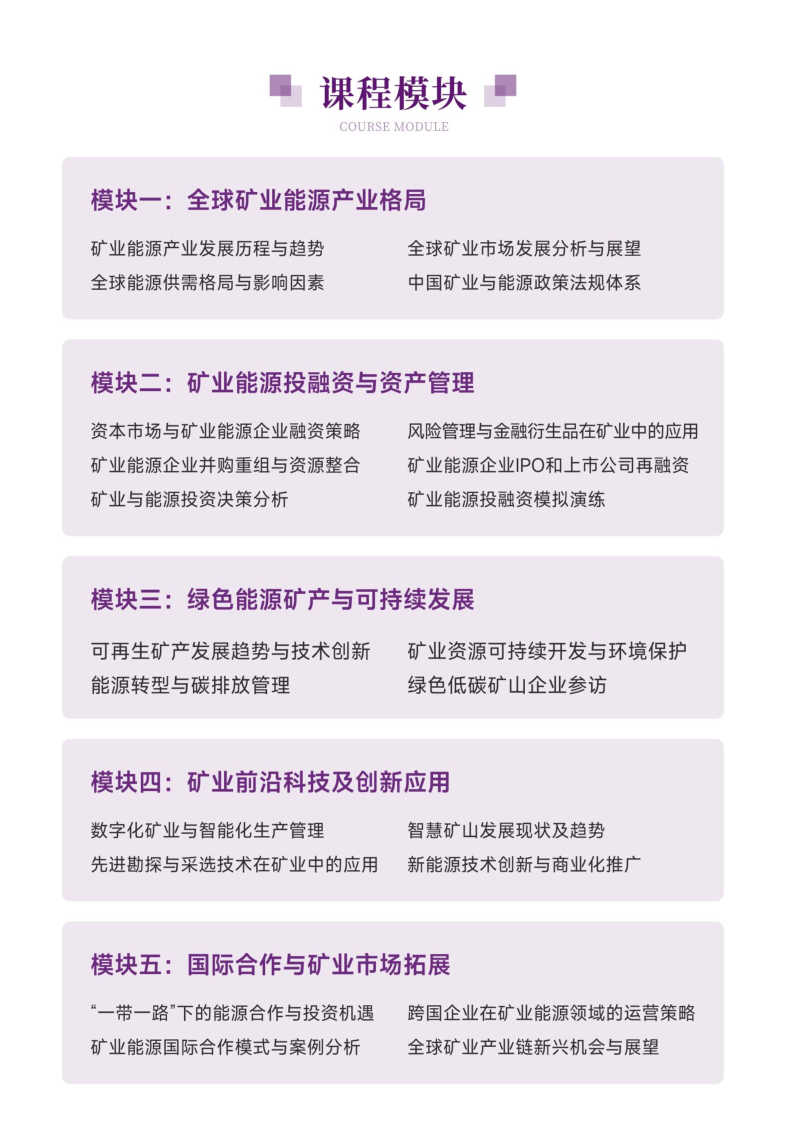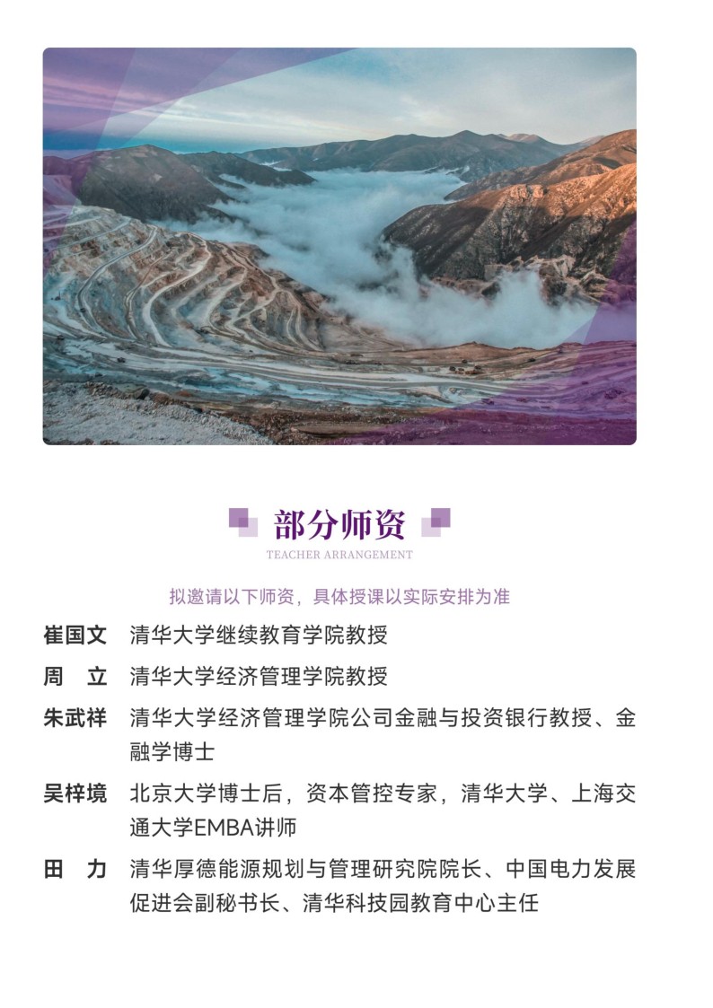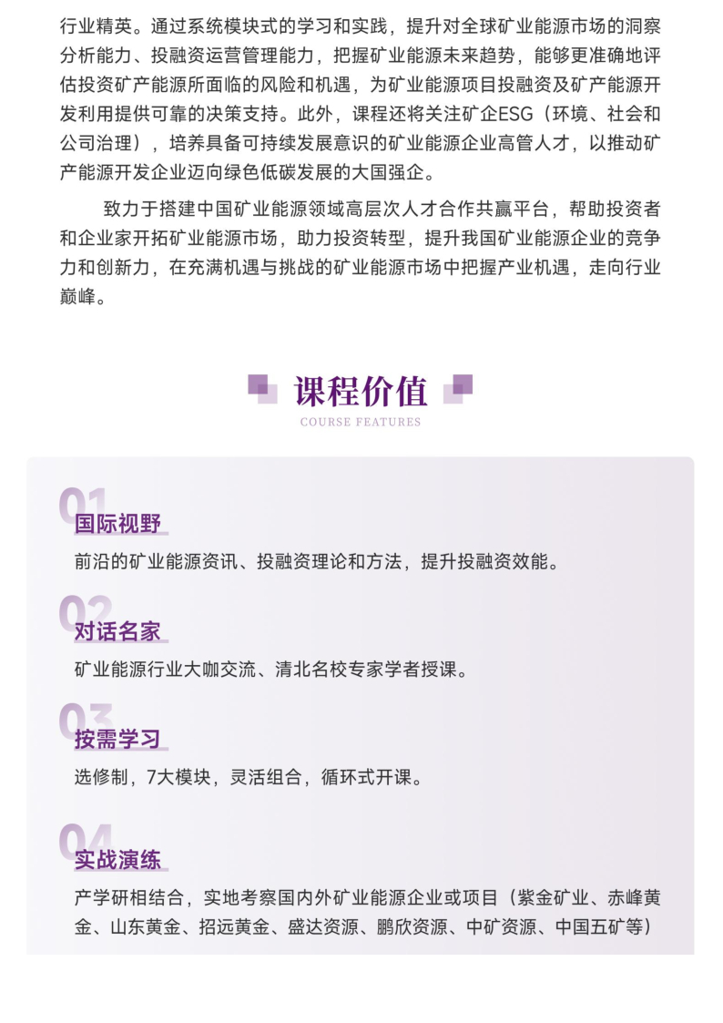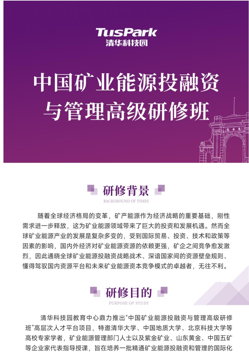 | 課程簡(jiǎn)介: | 清華科技園教育中心鼎力推出“中國(guó)礦業(yè)能源投融資與管理高級(jí)研修 班”高層次人才平臺(tái)項(xiàng)目,特邀清華大學(xué)、中國(guó)地質(zhì)大學(xué)、北京科技大學(xué)等 高校專家學(xué)者,礦業(yè)能源管理部門人士以及紫金礦業(yè)、山東黃金、中國(guó)五礦 等企業(yè)家代表指導(dǎo)授課,旨在培養(yǎng)一批精通礦業(yè)能源投融資和管理的國(guó)際化 行業(yè)精英。通過(guò)系統(tǒng)模塊式的學(xué)習(xí)和實(shí)踐,提升對(duì)全球礦業(yè)能源市場(chǎng)的洞察 分析能力、投融資運(yùn)營(yíng)管理能力,把握礦業(yè)能源未來(lái)趨勢(shì),能夠更準(zhǔn)確地評(píng) 估投資礦產(chǎn)能源所面臨的風(fēng)險(xiǎn)和機(jī)遇,為礦業(yè)能源項(xiàng)目投融資及礦產(chǎn)能源開 發(fā)利用提供可靠的決策支持。 | |