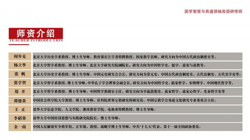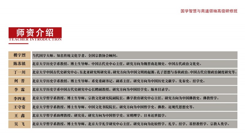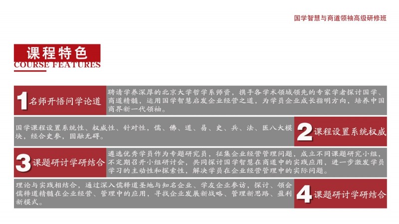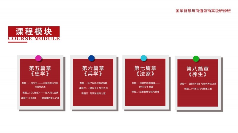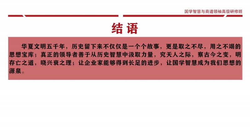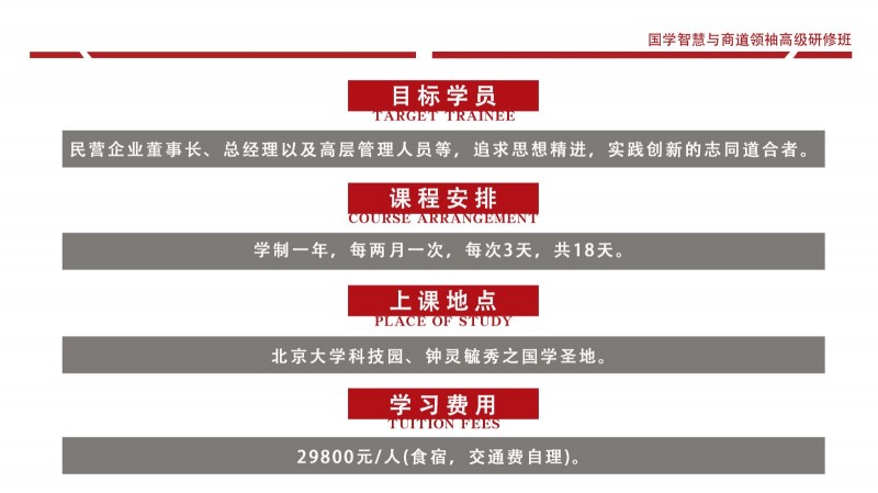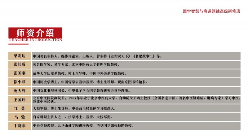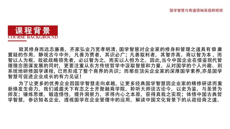 | 課程簡介: | 致其修身而遠志廉善,齊家弘業(yè)乃寬孝明清。國學智慧對企業(yè)家的修身和管理之道具有毋庸置疑的作用。靜觀古今中外,凡善為賈者,其識必廣,凡善取利者,其智亦高。商以智為本,而智以人為樞,故欲戰(zhàn)略領先者,必以智為之,而實以人恒為之。因此,當今中國企業(yè)在借鑒現(xiàn)代管理理念圖謀發(fā)展的同時,更要注重從東方傳統(tǒng)哲學中汲取智慧和力量。從對國學的個人興趣、到系統(tǒng)地研修國學課程,已然形成了整個商界的共識;而那些頂尖企業(yè)家的深厚國學素養(yǎng),亦是國學智慧可促進企業(yè)成長的有力見證!為了讓更多的優(yōu)秀企業(yè)因國學智慧走向卓越,讓更多經(jīng)典國學智慧因 | |