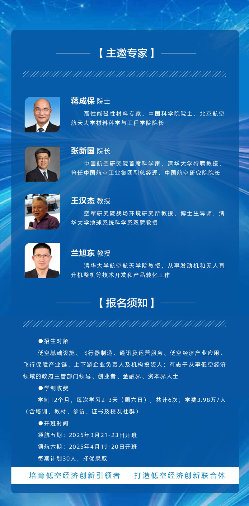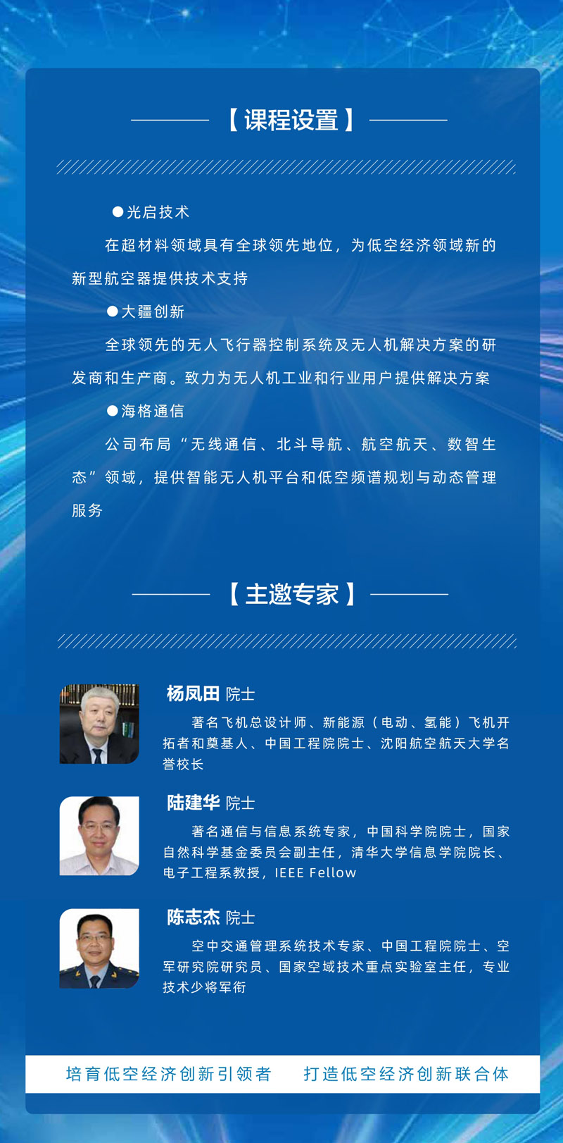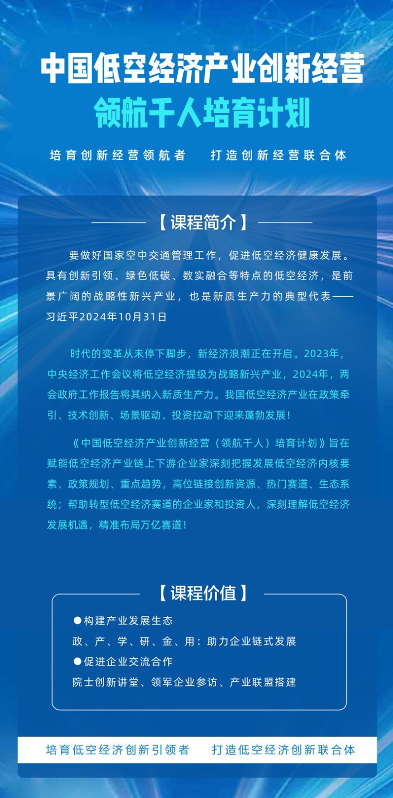 | 課程簡(jiǎn)介: | 《中國(guó)低空經(jīng)濟(jì)產(chǎn)業(yè)創(chuàng)新經(jīng)營(yíng)(領(lǐng)航千人)培育計(jì)劃》旨在賦能低空經(jīng)濟(jì)產(chǎn)業(yè)鏈上下游企業(yè)家深刻把握發(fā)展低空經(jīng)濟(jì)內(nèi)核要素、政策規(guī)劃、重點(diǎn)趨勢(shì),高位鏈接創(chuàng)新資源、熱門賽道、生態(tài)系統(tǒng);幫助轉(zhuǎn)型低空經(jīng)濟(jì)賽道的企業(yè)家和投資人,深刻理解低空經(jīng)濟(jì)發(fā)展機(jī)遇,精準(zhǔn)布局萬(wàn)億賽道! | |