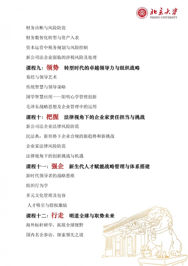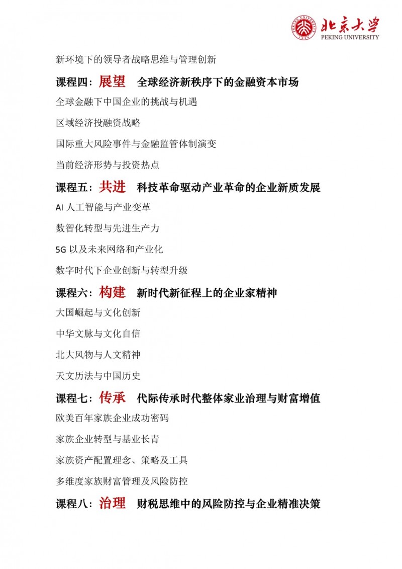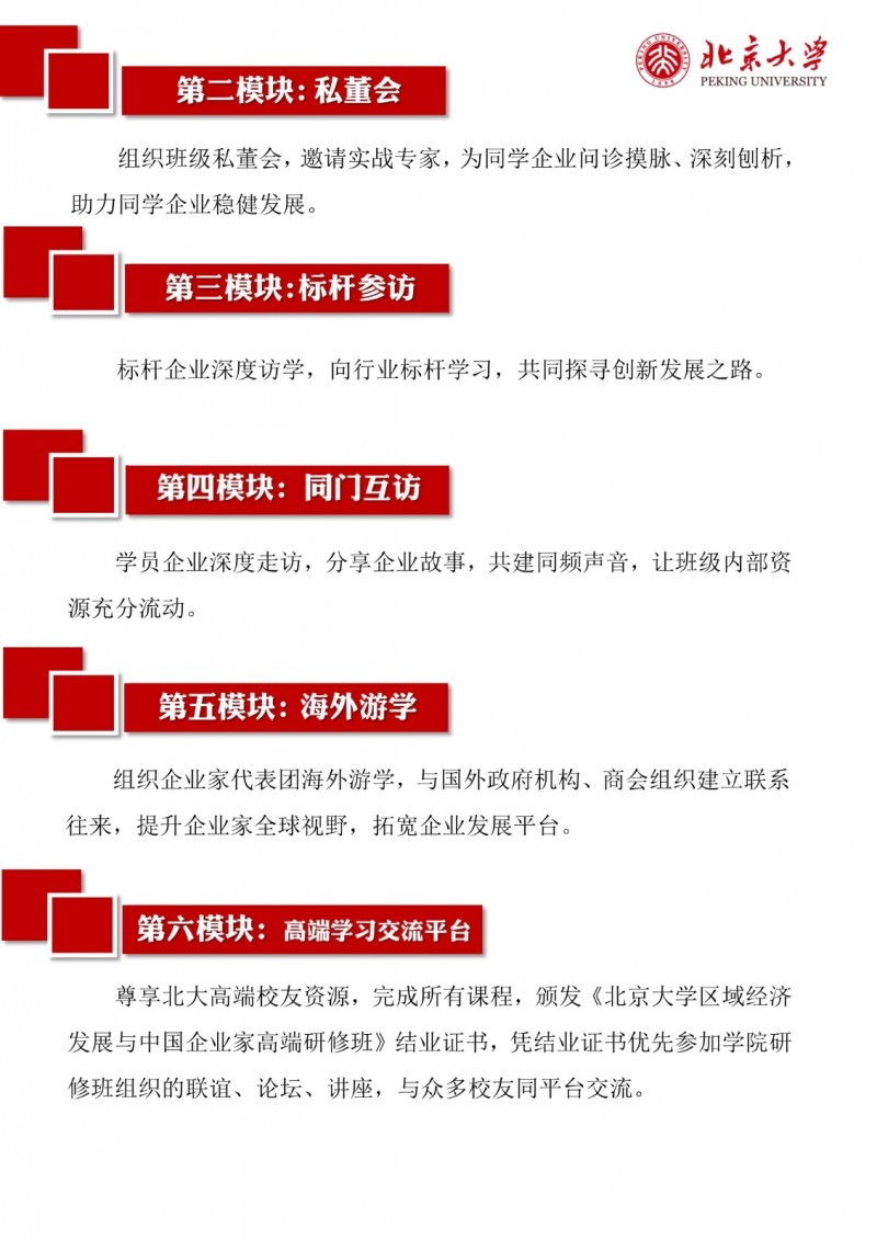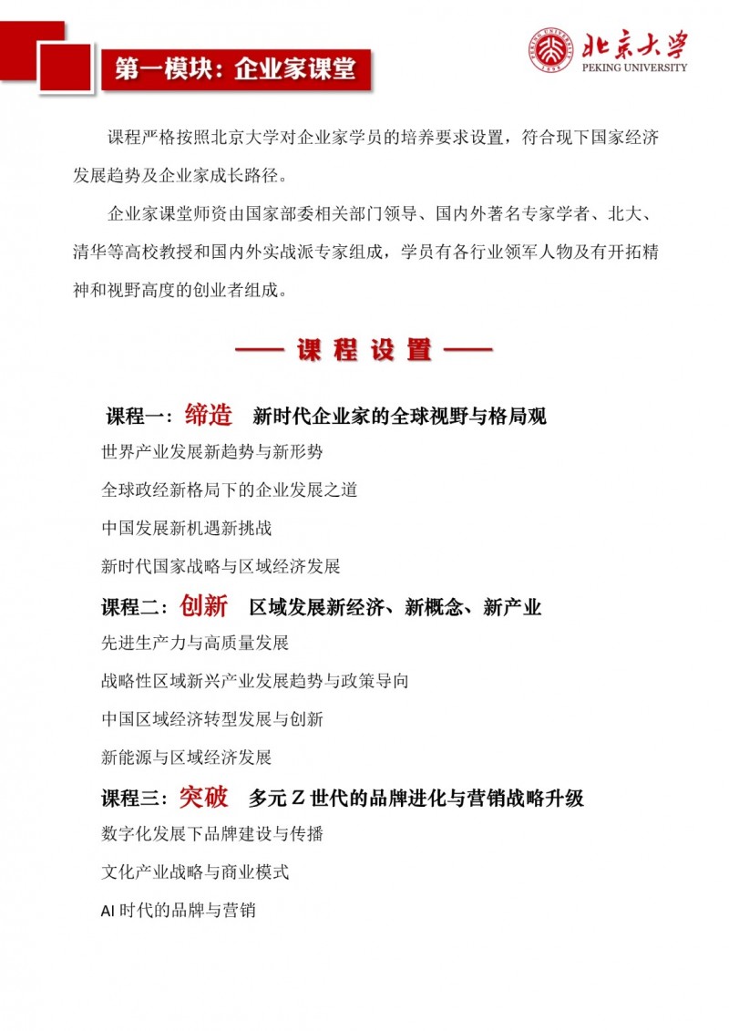 | 課程簡介: | 北京大學區(qū)域經濟發(fā)展與中國企業(yè)家高端研修班(三期)以“新思維、新視角、新觀點、新模式”為理念,致力于培養(yǎng)具有全球視野、創(chuàng)新能力和深厚社會責任感的企業(yè)家群體?。研修班緊扣國家戰(zhàn)略,結合區(qū)域經濟發(fā)展特點,設置多元化的課程體系,涵蓋全球產業(yè)趨勢、區(qū)域經濟轉型、品牌營銷升級、金融資本市場、科技革命驅動、企業(yè)家精神構建等核心模塊?。課程特色包括師資卓越、實戰(zhàn)性強、資源整合,學制18個月,每月集中授課兩天,學習費用為19.8萬元人民幣?。完成課程后,學員將獲得北京大學頒發(fā)的結業(yè)證書,并優(yōu)先參與校友活動,共享北大資源? | |