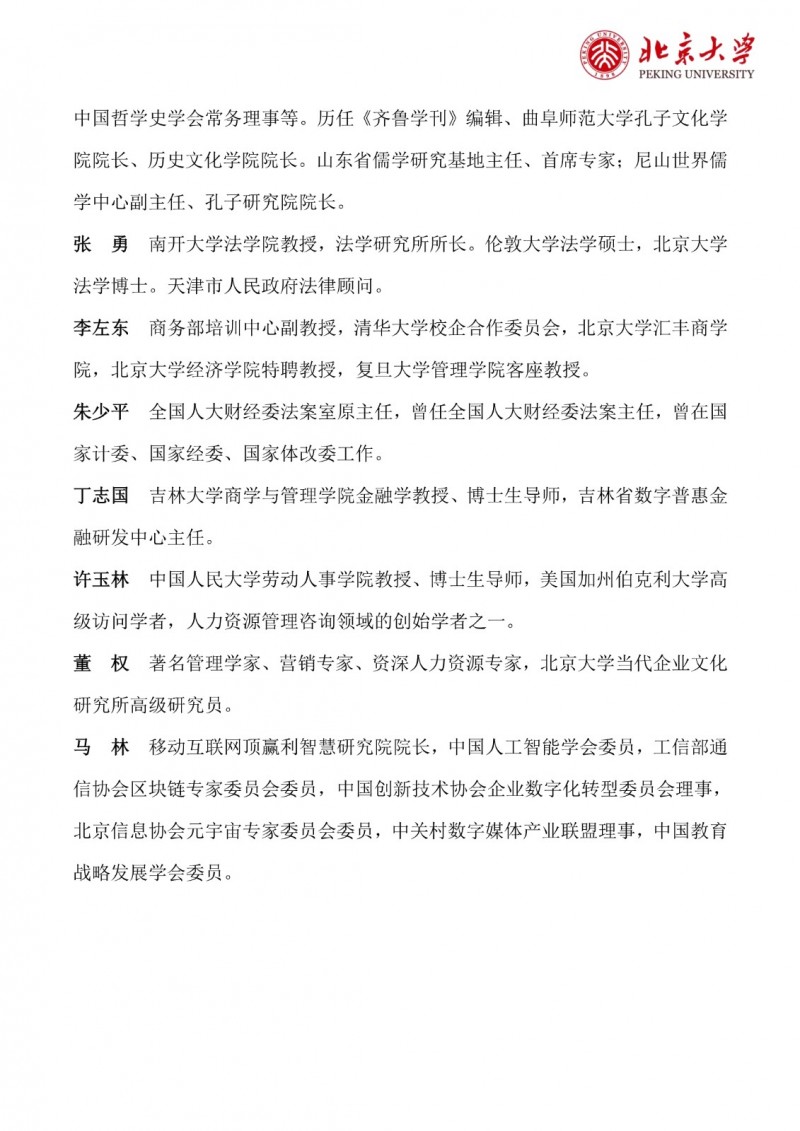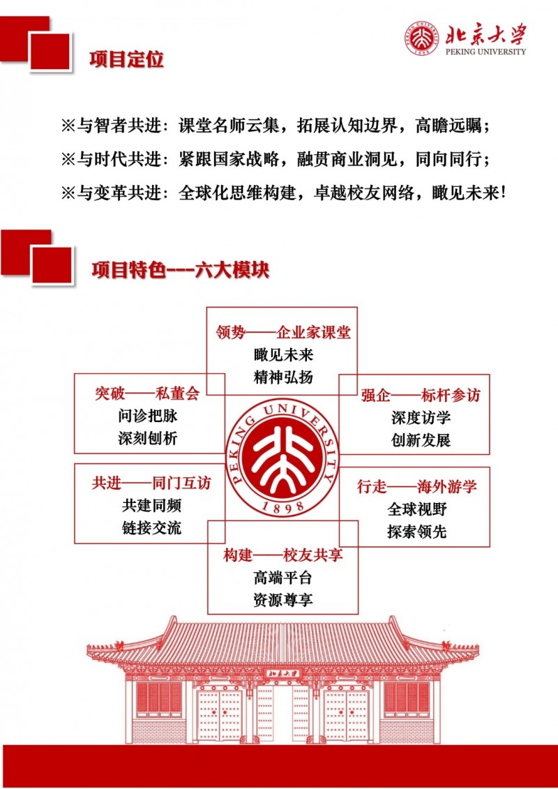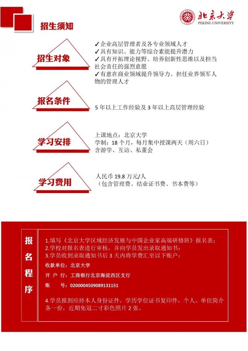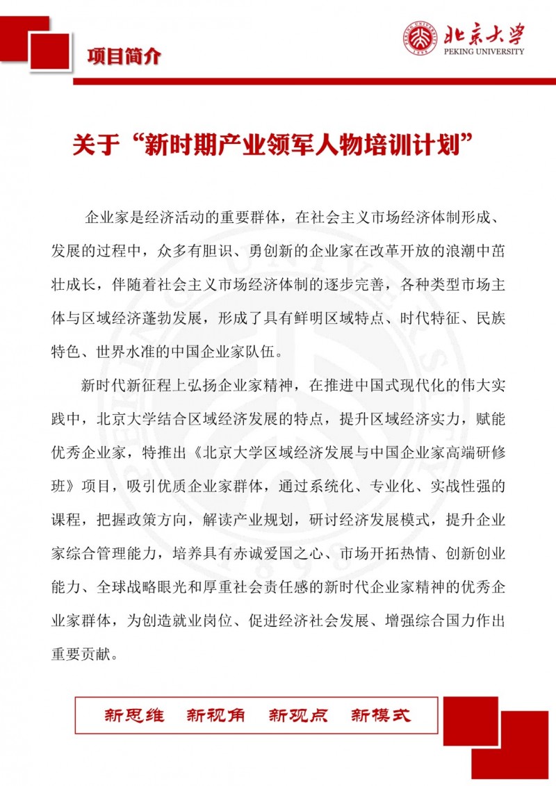 | 課程簡介: | 北京大學區(qū)域經濟發(fā)展與中國企業(yè)家高端研修班(三期)以“新思維、新視角、新觀點、新模式”為理念,致力于培養(yǎng)具有全球視野、創(chuàng)新能力和深厚社會責任感的企業(yè)家群體?。研修班緊扣國家戰(zhàn)略,結合區(qū)域經濟發(fā)展特點,設置多元化的課程體系,涵蓋全球產業(yè)趨勢、區(qū)域經濟轉型、品牌營銷升級、金融資本市場、科技革命驅動、企業(yè)家精神構建等核心模塊?。課程特色包括師資卓越、實戰(zhàn)性強、資源整合,學制18個月,每月集中授課兩天,學習費用為19.8萬元人民幣?。完成課程后,學員將獲得北京大學頒發(fā)的結業(yè)證書,并優(yōu)先參與校友活動,共享北大資源? | |