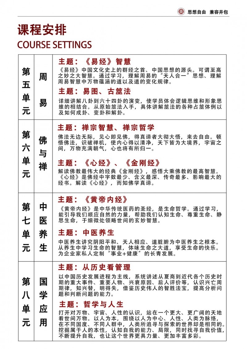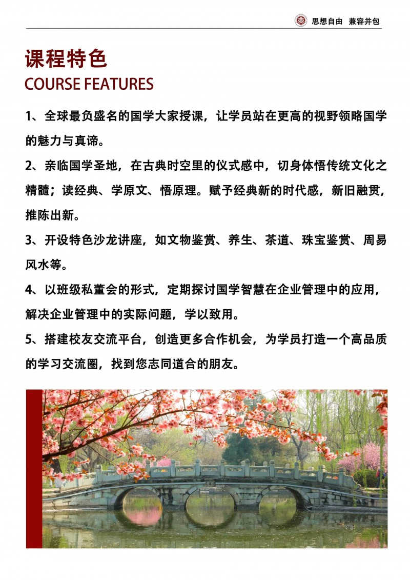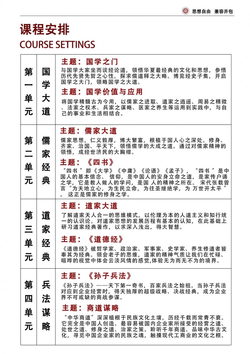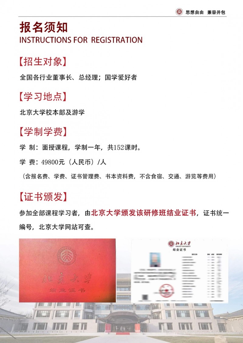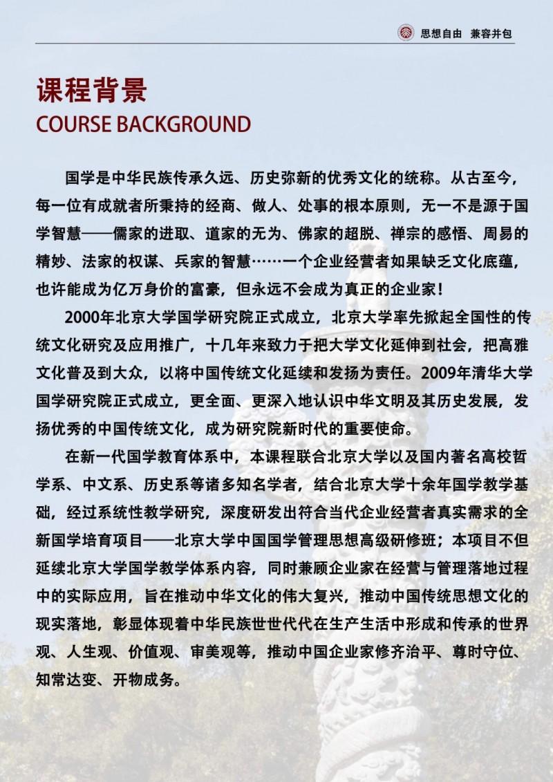 | 課程簡介: | 北京大學(xué)中國國學(xué)管理思想高級研修班是面向企業(yè)高管的高端培訓(xùn)項目,系統(tǒng)講授儒、道、法、兵等傳統(tǒng)智慧在現(xiàn)代管理中的應(yīng)用,通過經(jīng)典研讀、案例研討和實地考察,培養(yǎng)學(xué)員的戰(zhàn)略思維與領(lǐng)導(dǎo)力,助力企業(yè)實現(xiàn)文化傳承與創(chuàng)新發(fā)展。 | |