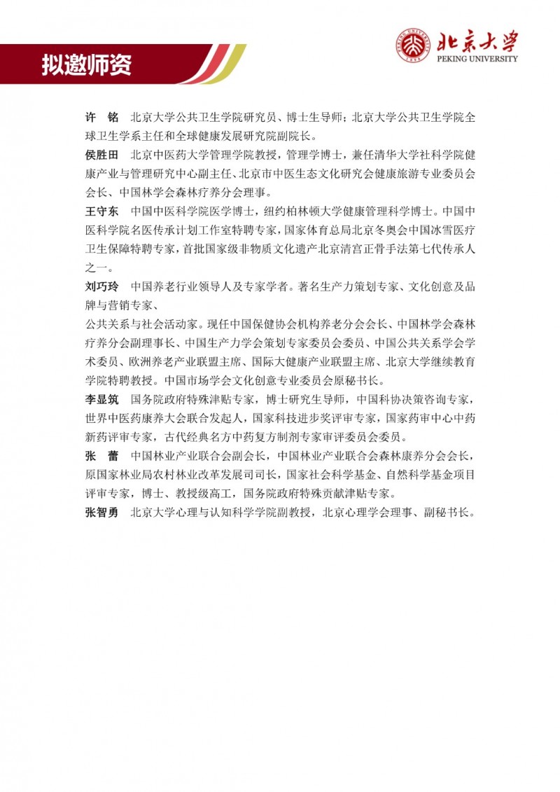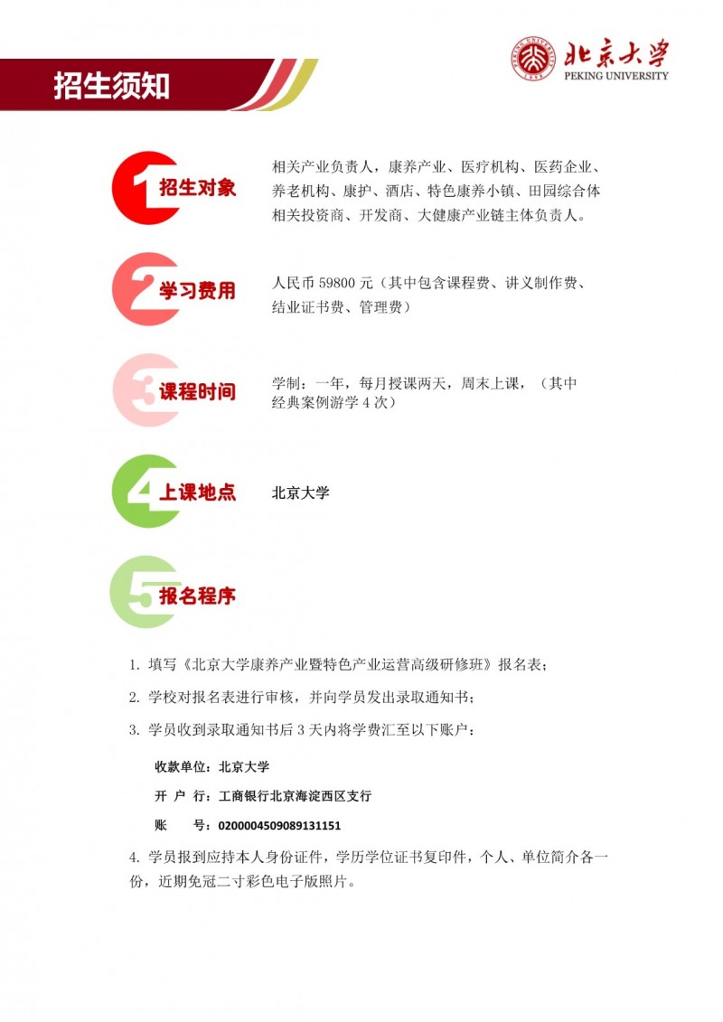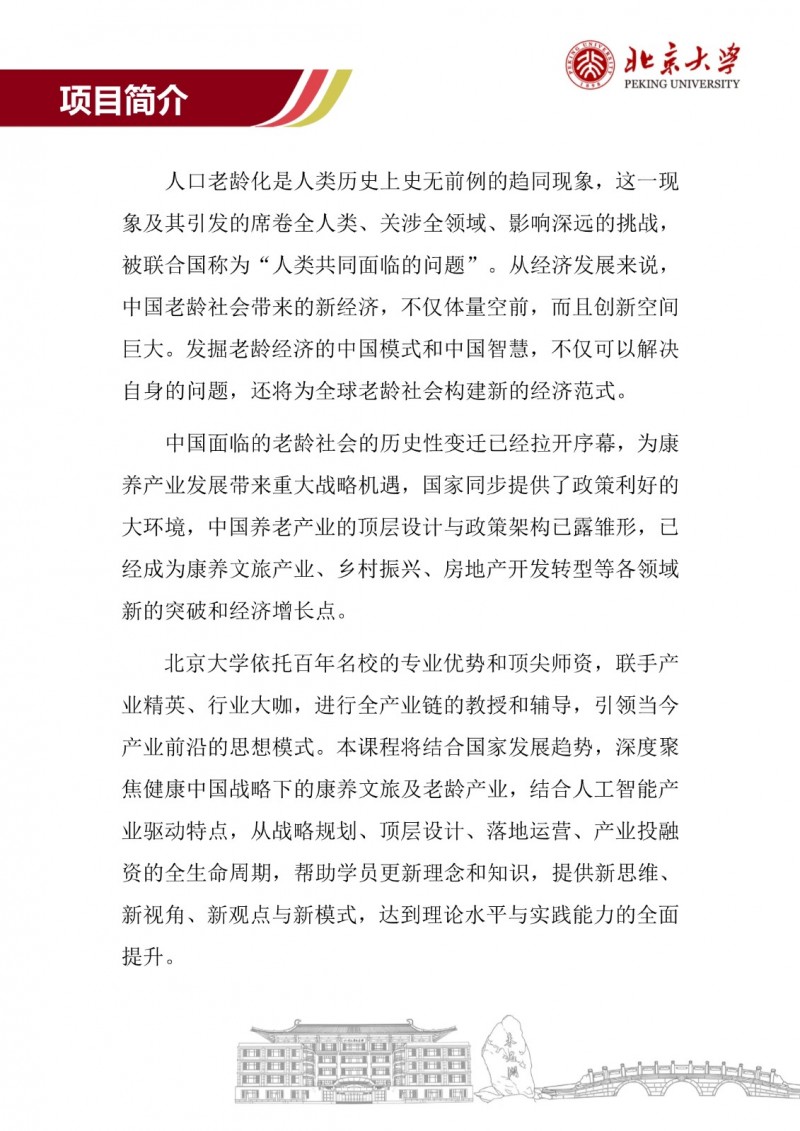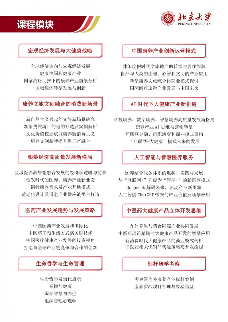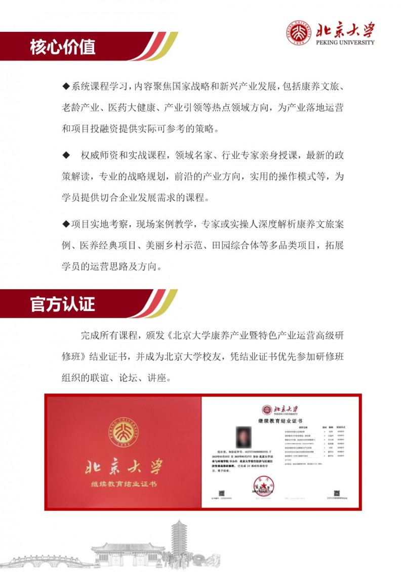 | 課程簡介: | 北京大學康養(yǎng)產業(yè)暨特色產業(yè)運營高級研修班聚焦國家鄉(xiāng)村振興與大健康戰(zhàn)略,系統(tǒng)講授康養(yǎng)文旅、田園綜合體開發(fā)、產業(yè)投融資等全產業(yè)鏈知識?。課程融合宏觀政策解讀與實戰(zhàn)案例,由部委領導、行業(yè)專家及北大教授聯(lián)合授課,助力企業(yè)管理者更新理念、提升運營能力?。完成課程可獲北大結業(yè)證書,并優(yōu)先參與行業(yè)論壇與資源對接?。 | |