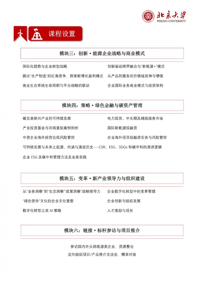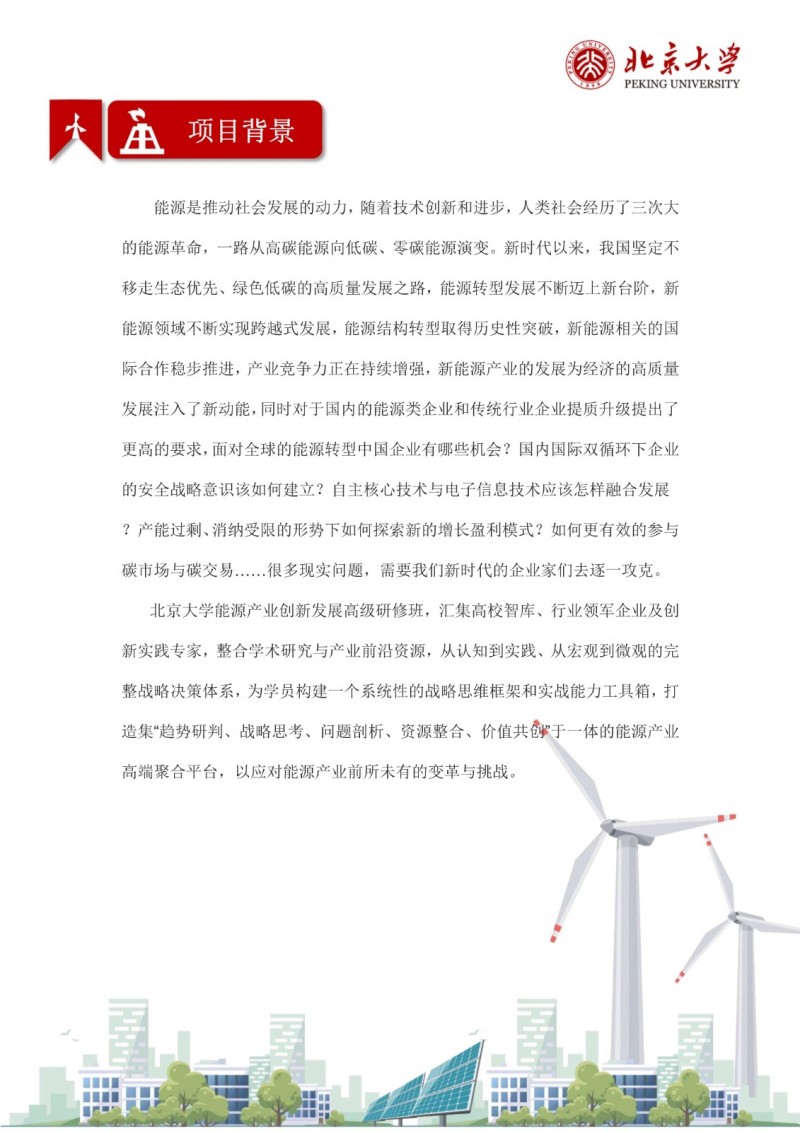 | 課程簡(jiǎn)介: | 北京大學(xué)能源產(chǎn)業(yè)創(chuàng)新發(fā)展高級(jí)研修班,匯集高校智庫(kù)、行業(yè)領(lǐng)軍企業(yè)及創(chuàng)新實(shí)踐專家,整合學(xué)術(shù)研究與產(chǎn)業(yè)前沿資源,從認(rèn)知到實(shí)踐、從宏觀到微觀的完整戰(zhàn)略決策體系,為學(xué)員構(gòu)建一個(gè)系統(tǒng)性的戰(zhàn)略思維框架和實(shí)戰(zhàn)能力工具箱,打造集“趨勢(shì)研判、戰(zhàn)略思考、問(wèn)題剖析、資源整合、價(jià)值共創(chuàng)"于一體的能源產(chǎn)業(yè)高端聚合平臺(tái),以應(yīng)對(duì)能源產(chǎn)業(yè)前所未有的變革與挑戰(zhàn)。 | |