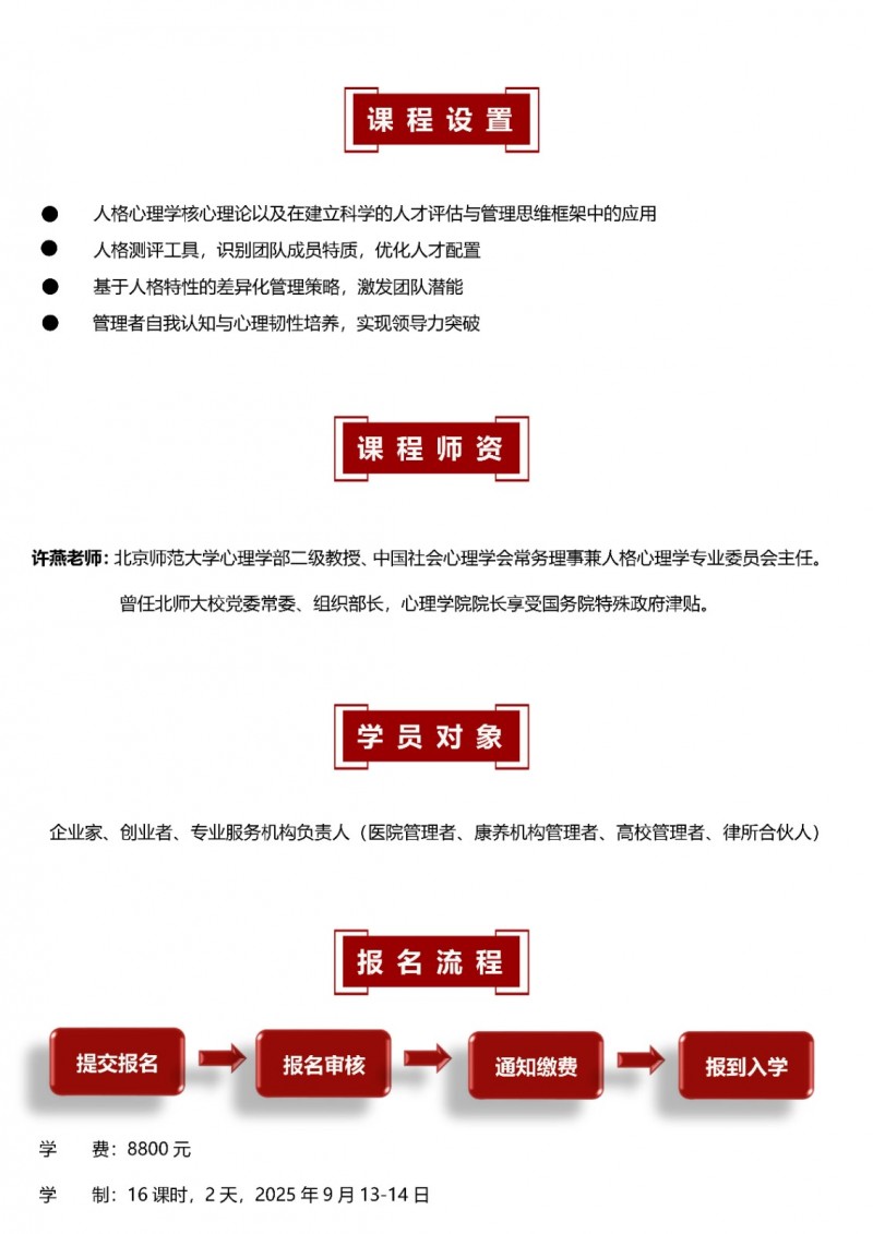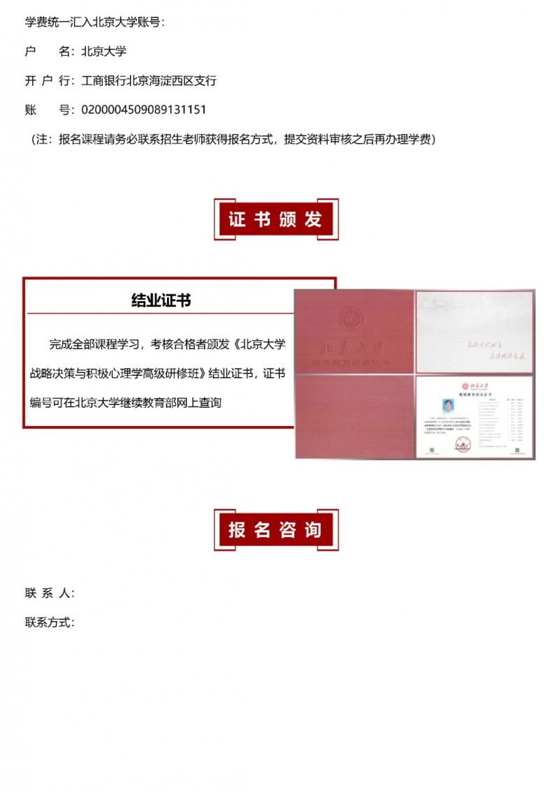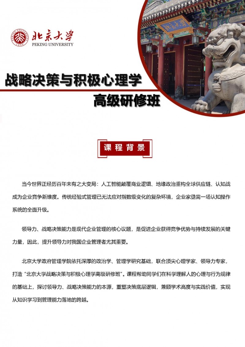 | 課程簡介: | 北京大學(xué)戰(zhàn)略決策與積極心理學(xué)高級研修班由北京大學(xué)政府管理學(xué)院開設(shè),聚焦決策心理學(xué)、管理心理學(xué)與積極心理學(xué)三大領(lǐng)域,旨在幫助企業(yè)家突破認(rèn)知局限,實(shí)現(xiàn)從經(jīng)驗(yàn)直覺到系統(tǒng)思維的跨越?。課程通過案例推演、角色模擬、心理測評等多元沉浸式教學(xué),將前沿理論轉(zhuǎn)化為戰(zhàn)略決策與團(tuán)隊(duì)激勵(lì)的實(shí)戰(zhàn)工具?。學(xué)制靈活,完成課程且考核合格者可獲得北京大學(xué)頒發(fā)的結(jié)業(yè)證書?。 | |