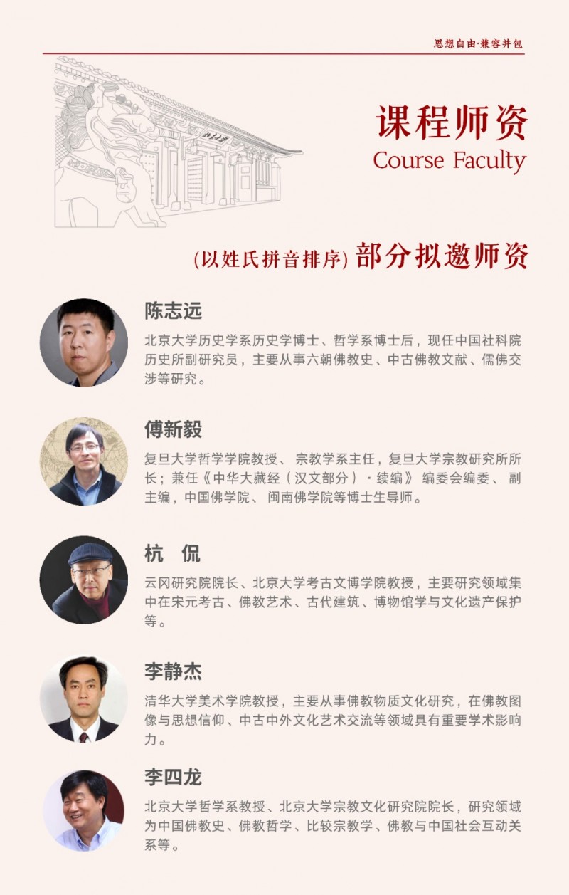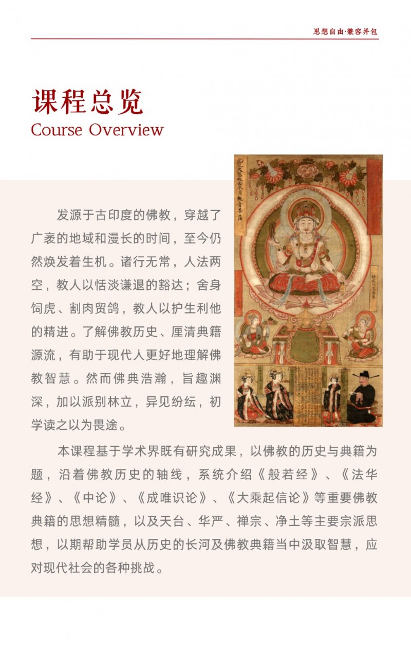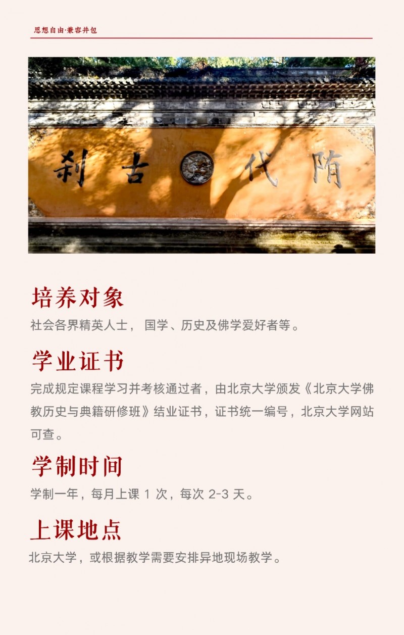 | 課程簡(jiǎn)介: | 北京大學(xué)佛教歷史與典籍研修班由北京大學(xué)歷史學(xué)系主辦,旨在系統(tǒng)梳理佛教從古印度起源到中國(guó)化的歷史脈絡(luò),深入解讀《般若經(jīng)》《法華經(jīng)》等核心典籍及天臺(tái)、華嚴(yán)等宗派思想?。課程為期一年,每月集中授課2-3天,由北大及國(guó)內(nèi)頂尖高校學(xué)者聯(lián)合授課,學(xué)員完成學(xué)業(yè)后可獲北大結(jié)業(yè)證書(shū)?。該研修班適合國(guó)學(xué)、佛學(xué)愛(ài)好者及社會(huì)精英,通過(guò)歷史與典籍的結(jié)合,幫助學(xué)員汲取佛學(xué)智慧應(yīng)對(duì)現(xiàn)代挑戰(zhàn)?。 | |