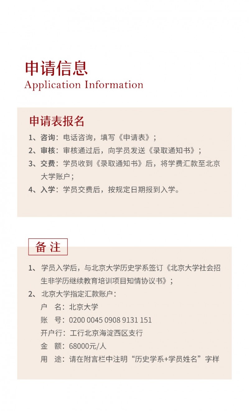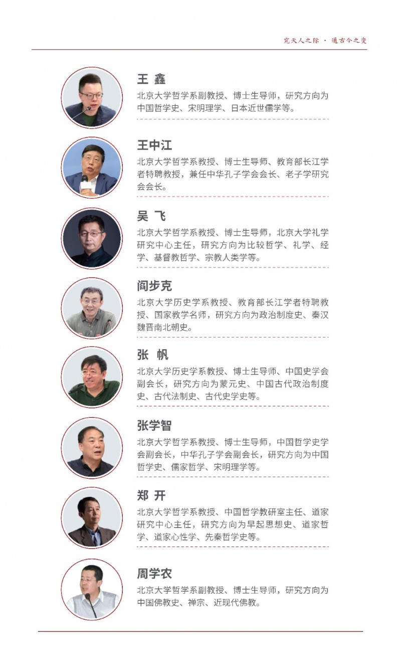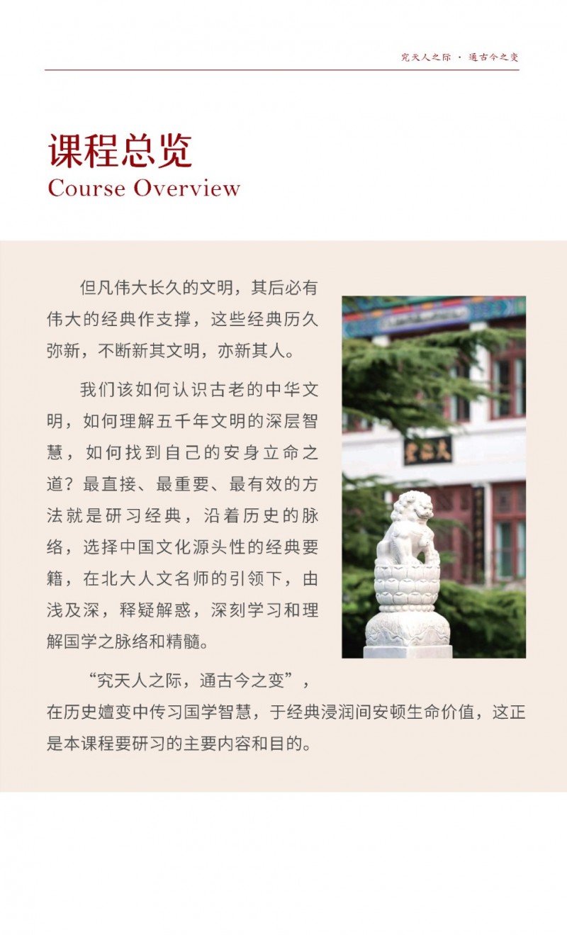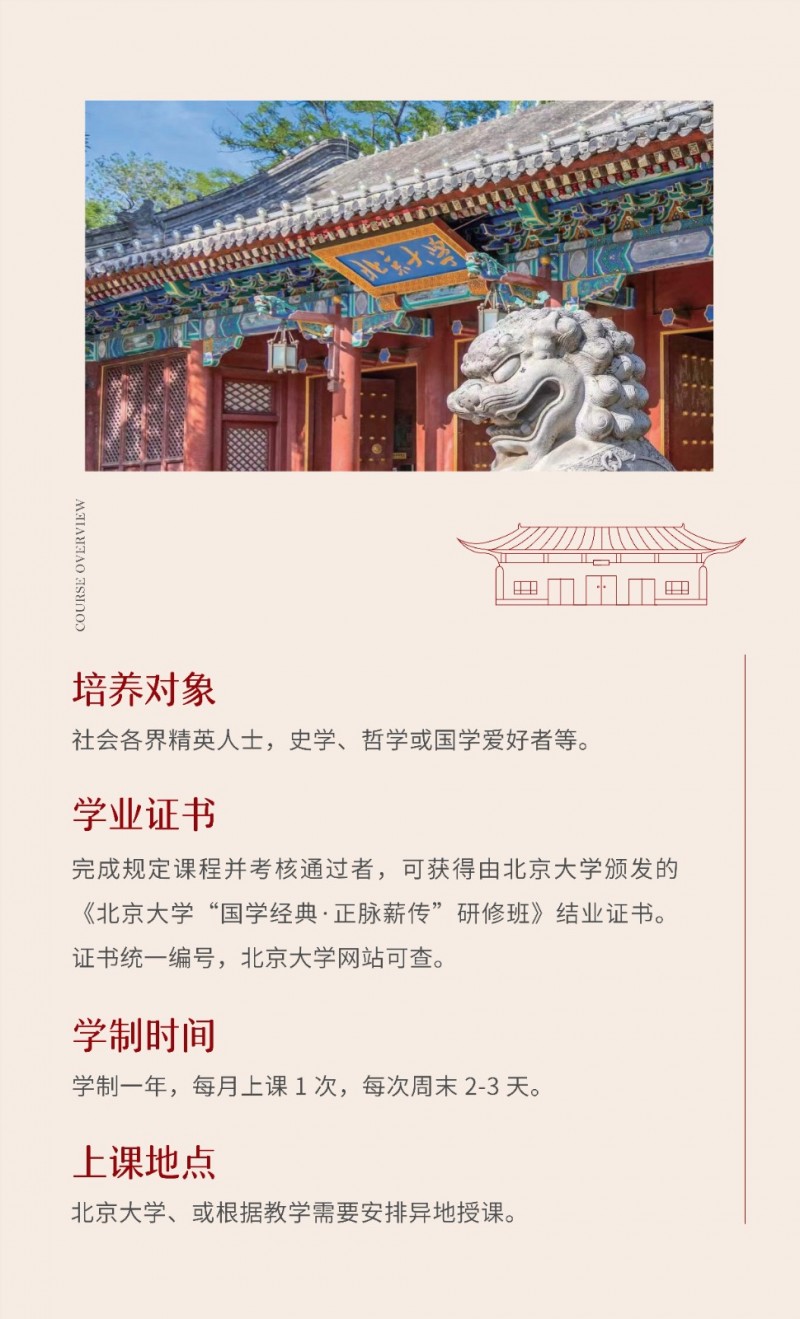 | 課程簡介: | 北京大學“國學經典·正脈薪傳”研修班由歷史學系主辦,系統(tǒng)研讀《周易》《道德經》《論語》等核心典籍,融合游學實踐與名師授課,旨在傳承中華文明智慧。學制一年,每月集中授課2-3天,結業(yè)頒發(fā)北大證書,適合文化愛好者及精英人士深度學習?。 | |
