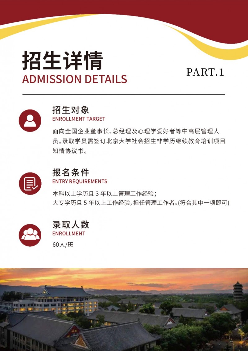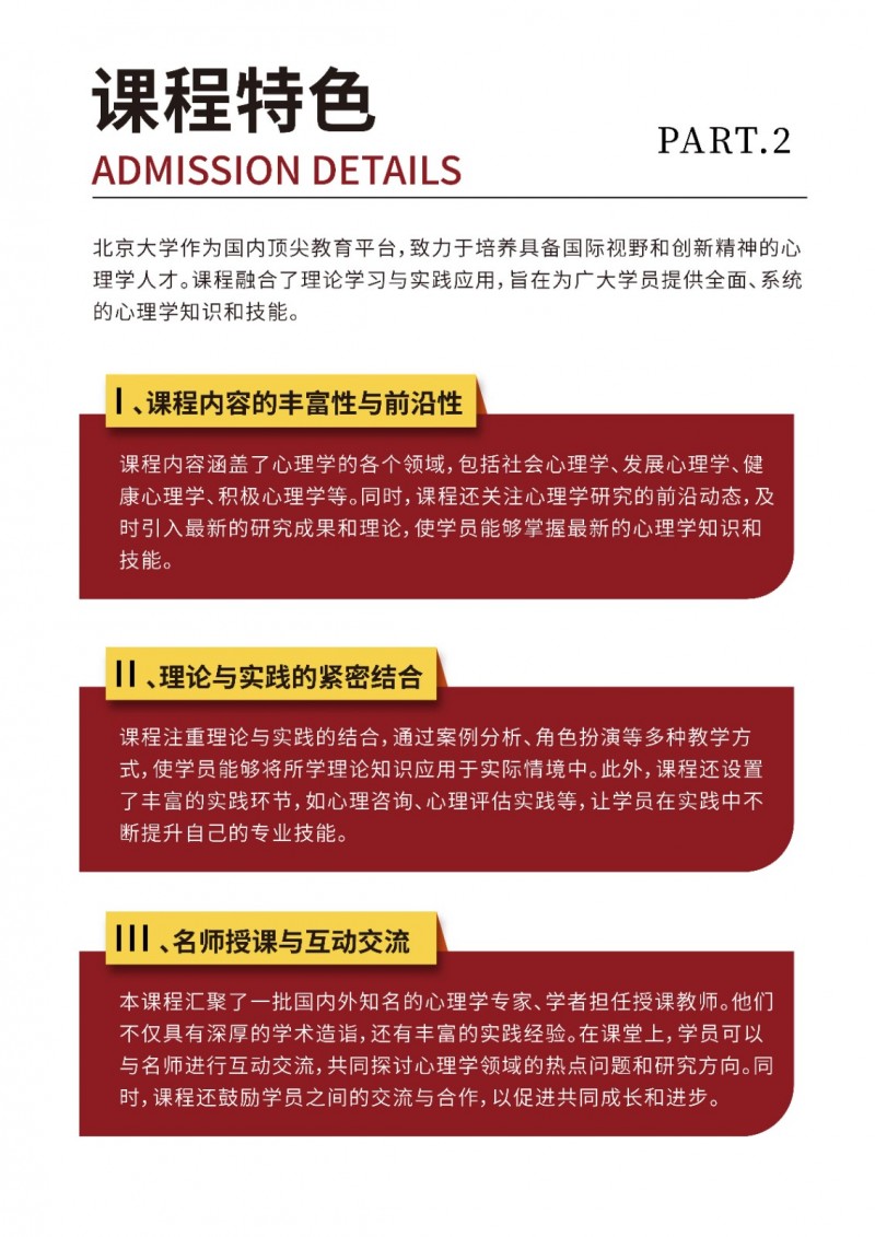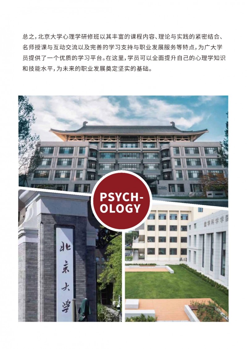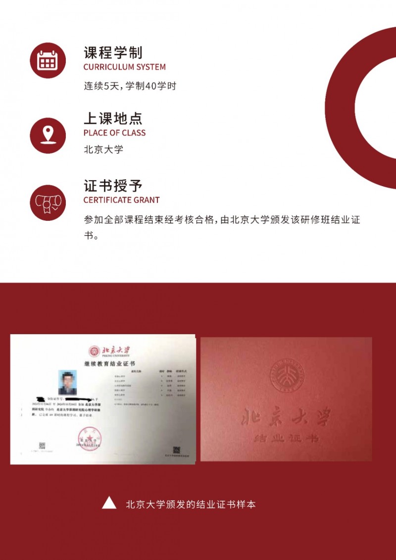 | 課程簡介: | 北京大學(xué)心理學(xué)研修班依托頂尖師資與前沿課程,聚焦認(rèn)知科學(xué)、臨床心理等核心領(lǐng)域,采用案例研討與實證研究結(jié)合的教學(xué)模式。學(xué)員可獲北大結(jié)業(yè)證書,系統(tǒng)提升理論應(yīng)用能力,拓展專業(yè)人脈。適合教育、醫(yī)療、企業(yè)管理等領(lǐng)域從業(yè)者進(jìn)修,助力職業(yè)發(fā)展與個人成長。 | |