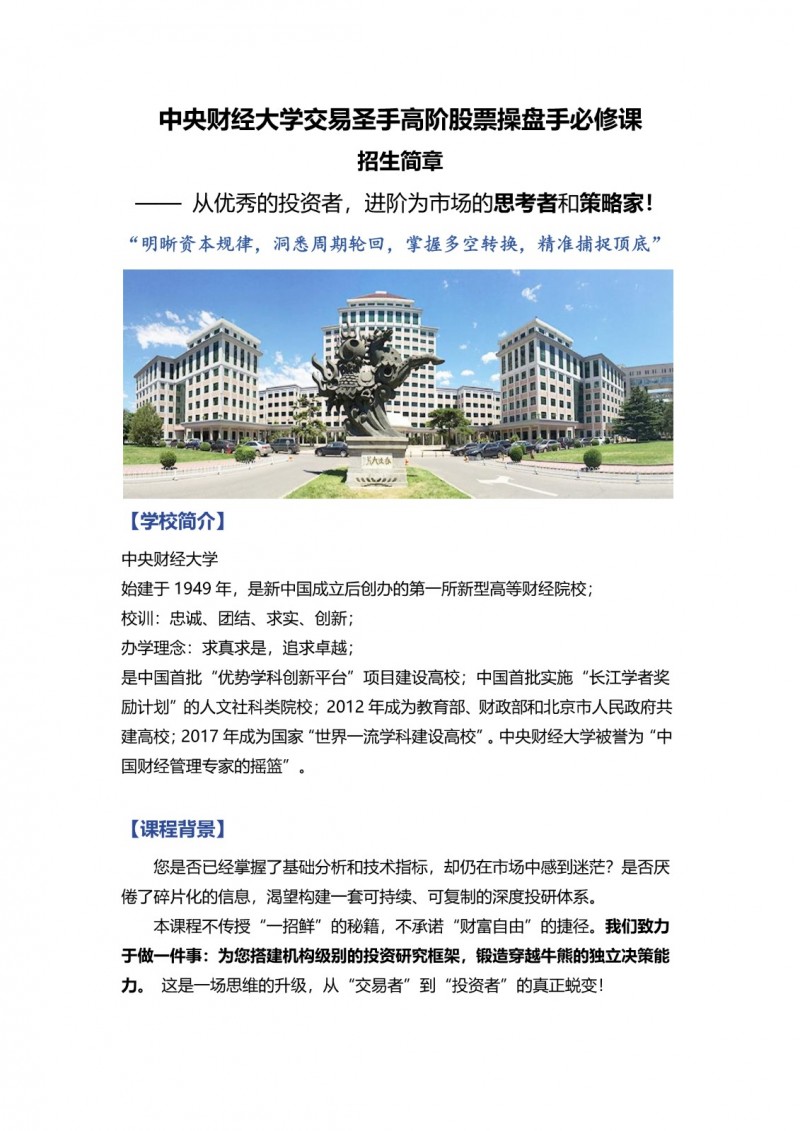 在信息過載、波動加劇的現(xiàn)代金融市場中,許多投資者即便掌握了基礎(chǔ)分析工具,仍深感迷茫與無力。碎片化的知識難以拼湊成持續(xù)盈利的藍圖,市場呼喚的是系統(tǒng)性的投資哲學(xué)與可復(fù)制的決策框架。正是基于此,中央財經(jīng)大學(xué)繼續(xù)教育學(xué)院依托其深厚的學(xué)術(shù)底蘊與行業(yè)資源,重磅推出了“交易圣手高階股票操盤手必修課”。本課程并非承諾一夜暴富的“秘籍”,而是一場旨在幫助學(xué)員完成從“交易者”到“投資者”深刻蛻變的思維升級之旅。它致力于為學(xué)員搭建機構(gòu)級別的投研體系,鍛造能夠穿越市場牛熊周期的獨立決策能力?。