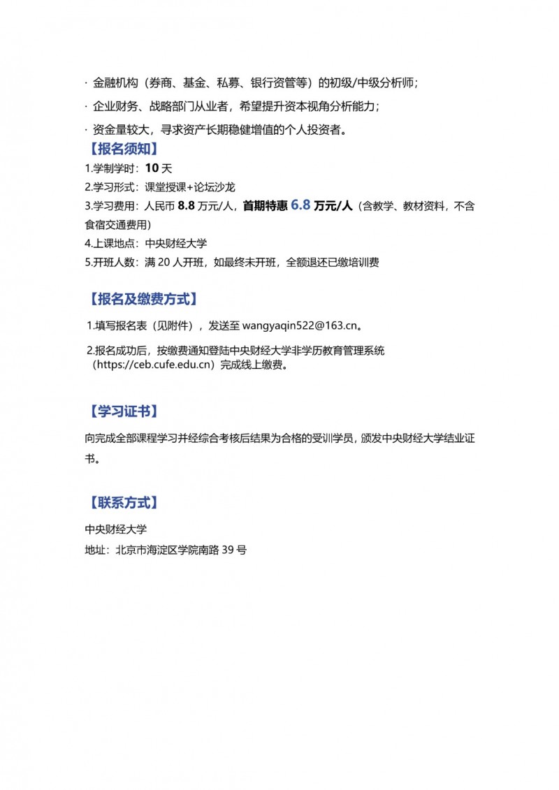 課程學(xué)制通常為2個月左右,采用每月集中數(shù)天授課的模式,兼顧學(xué)習深度與時間靈活性。課程設(shè)有開班人數(shù)要求,確保教學(xué)服務(wù)質(zhì)量。尤為值得一提的是,課程為學(xué)員提供了極具價值的增值服務(wù),包括?免費復(fù)訓(xùn)?機會以鞏固學(xué)習成果,以及接入?中央財經(jīng)大學(xué)高端校友金融圈層?,與來自銀行、證券、投資等領(lǐng)域的精英交流,拓展寶貴的人脈與資源網(wǎng)絡(luò)。