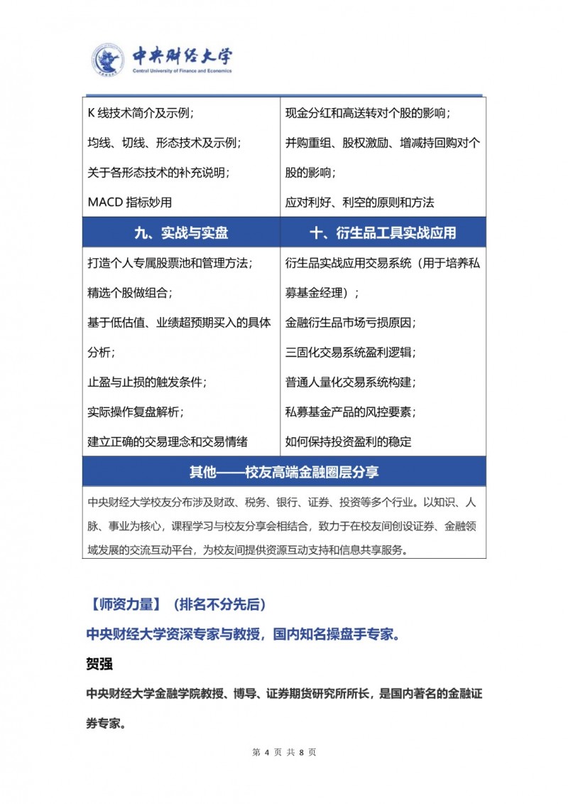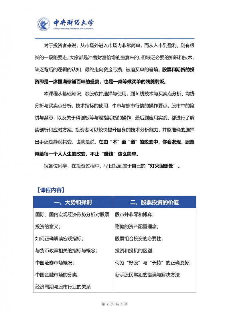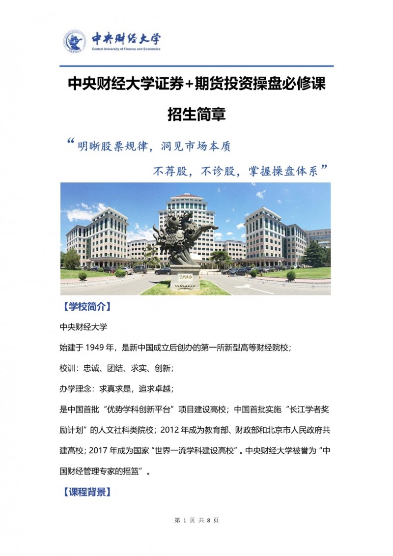 本課程是中央財(cái)經(jīng)大學(xué)繼續(xù)教育學(xué)院面向社會(huì)推出的精品實(shí)戰(zhàn)培訓(xùn)項(xiàng)目,其定位是為有意系統(tǒng)提升金融投資能力的各類人群,搭建一個(gè)從理論到實(shí)踐、從入門(mén)到精通的橋梁。課程不承諾短期暴富,而是致力于傳授一套科學(xué)、可復(fù)制的投資分析框架與操盤(pán)體系,使學(xué)員能夠擺脫對(duì)外部薦股的依賴,形成獨(dú)立的投資決策能力。