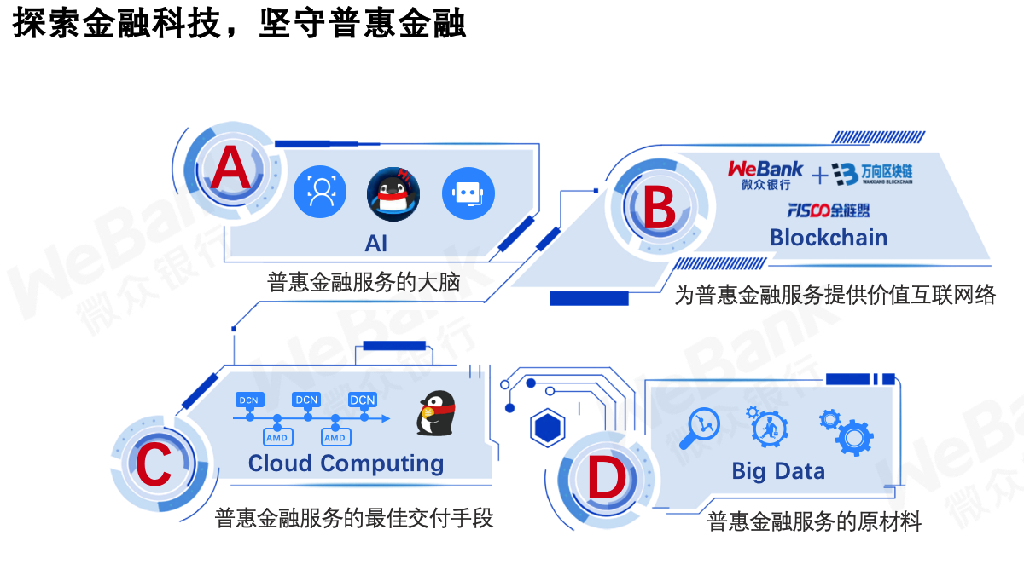 作為國內(nèi)第一家互聯(lián)網(wǎng)銀行、也是首家民營銀行,微眾銀行堅持科技立行、科技興行的發(fā)展之路,致力于推進(jìn)科技創(chuàng)新,堅持普惠金融的定位不動搖,在嚴(yán)守風(fēng)險合規(guī)底線的基礎(chǔ)上勇于開拓、積極創(chuàng)新,為探索互聯(lián)網(wǎng)金融新路、踐行普惠金融做出自己的貢獻(xiàn)。