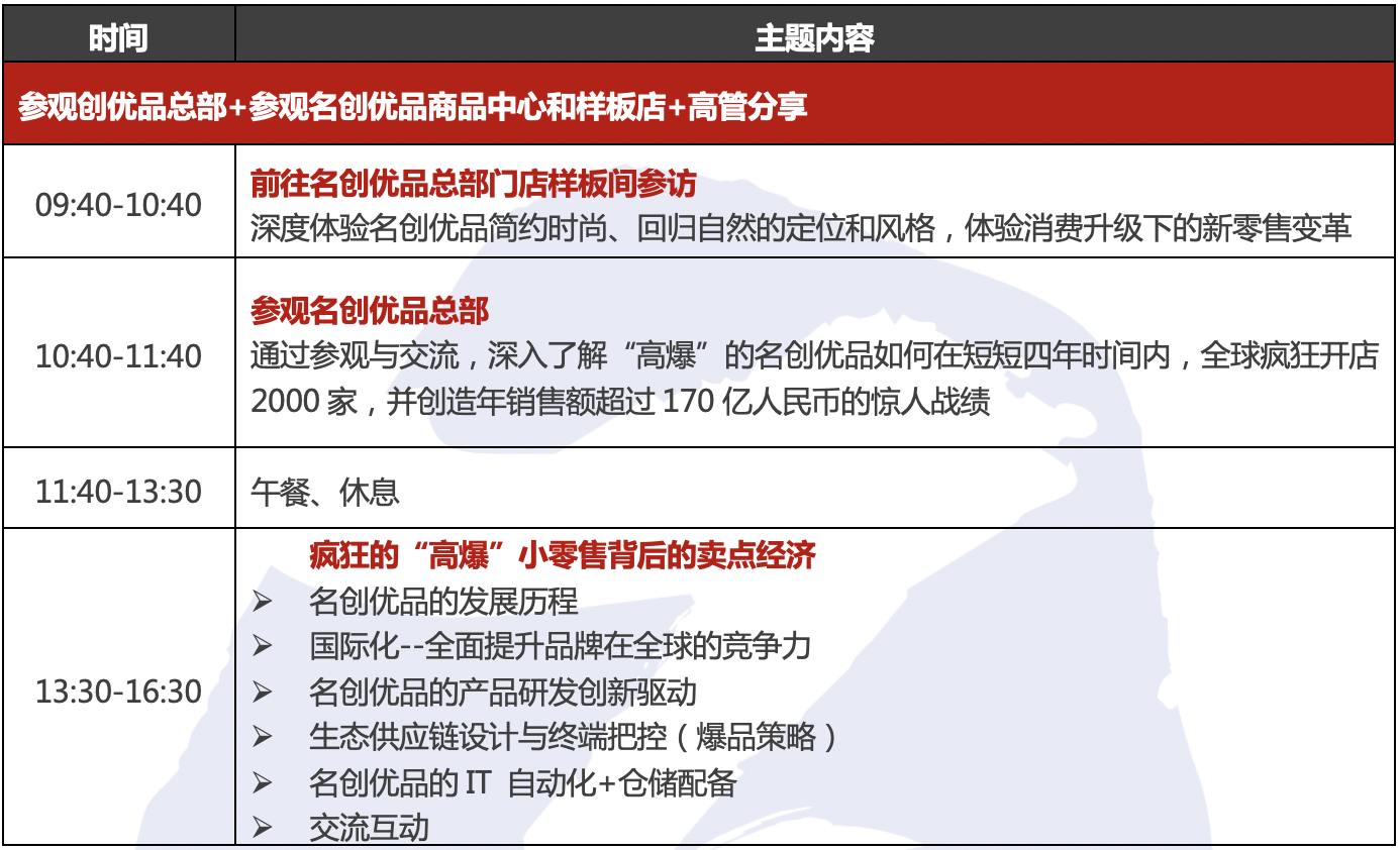 學(xué)習(xí)地點:廣州 學(xué)習(xí)對象:董事長、總經(jīng)理等高管、企業(yè)老總帶領(lǐng)人力資源、企業(yè)文化負責(zé)人、品牌部負責(zé)人等共同參加 名創(chuàng)優(yōu)品參訪項目背景 MINISO名創(chuàng)優(yōu)品是由日本設(shè)計師三宅順也先生和中國青年企業(yè)家葉國富先生共同創(chuàng)辦,三宅順也先生同時兼任首席設(shè)計師,葉國富任首席執(zhí)行官。 MINISO名創(chuàng)優(yōu)品奉行“簡約、自然、富質(zhì)感”的生活哲學(xué)和“回歸自然,還原產(chǎn)品本質(zhì)”的品牌主張,聚焦生活美學(xué)消費品,以極致的產(chǎn)品設(shè)計、極致的性價比、極致的購物體驗三個核心優(yōu)勢贏得消費者和市場的青睞,在生活家居市場刮起“個性化消費”之風(fēng)。 MINISO名創(chuàng)優(yōu)品一直倡導(dǎo)優(yōu)質(zhì)生活理念,并秉承“尊重消費者”的品牌精神,致力于為消費者提供真正"優(yōu)質(zhì)、創(chuàng)意、高性價比"的產(chǎn)品。MINISO名創(chuàng)優(yōu)品的產(chǎn)品簡約自然、品質(zhì)優(yōu)良、緊追消費潮流,因此深受18至35歲主流消費人群的喜愛。 名創(chuàng)優(yōu)品高管面對面探索名創(chuàng)優(yōu)品瘋狂的“高爆”小零售背后的“賣點經(jīng)濟“;走進名創(chuàng)優(yōu)品商品中心和樣板店,深度體驗名創(chuàng)優(yōu)品簡約時尚、回歸自然的定位和風(fēng)格。 為什么要向名創(chuàng)優(yōu)品學(xué)習(xí) 01 | 觀現(xiàn)場-走進名創(chuàng)優(yōu)品商品中心和樣板店,深度體驗名創(chuàng)優(yōu)品簡約時尚、回歸自然的定位和風(fēng)格。 02 | 找感悟-深刻感悟名創(chuàng)優(yōu)品一直倡導(dǎo)的優(yōu)質(zhì)生活理念及“尊重消費者”的品牌精神。 03 |面對面-與名創(chuàng)優(yōu)品高管面對面探索名創(chuàng)優(yōu)品瘋狂的“高爆”小零售背后的“賣點經(jīng)濟“。 04 | 互切磋-企業(yè)管理者齊聚一堂,交流切磋在當下時尚消費的前沿市場,如何引領(lǐng)“生活優(yōu)品消費”之新風(fēng)尚。 名創(chuàng)優(yōu)品參訪行程安排 名創(chuàng)優(yōu)品參訪往期回顧 名創(chuàng)優(yōu)品參訪教學(xué)信息 教學(xué)模式:參觀考察+主題分享+交流答疑 考察地點:廣州 費用包含:考察費、培訓(xùn)費、會議室費用、廣州當?shù)亟煌ㄙM用、發(fā)票